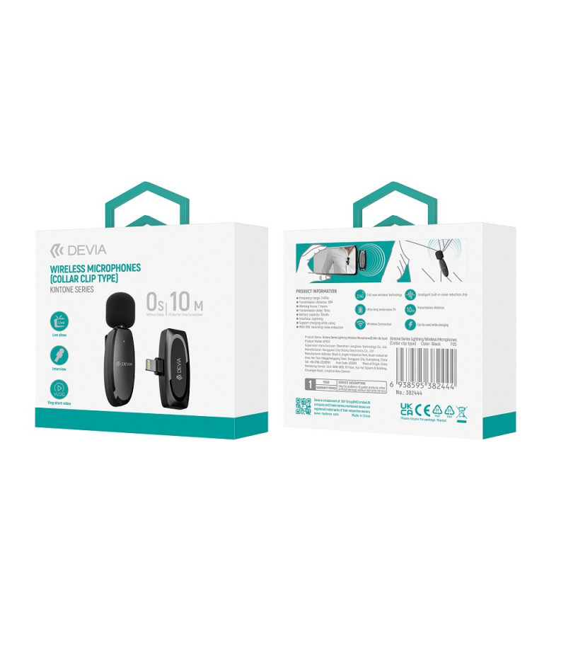 Mikrofon do telefonu Kintone Lightning bezprzewodowy krawatowy czarny Devia TFO GSM188413 Rejestruj dźwięk dzięki bezprzewodowemu mikrofonowi od Devi! Mikrofon z konektorem Lightning pozowoli na rejestrowanie wysokiej jakości dźwięku przy nagrywaniu video, streamingach czy wideorozmowach. Wbudowana bateria pozawala na 7h pracy. Nie potrzebujesz aplikacji do działania. Urządzenie działa w technologii Plug and Play, podłącz konektor i nagrywaj. Wbudowane ENC...