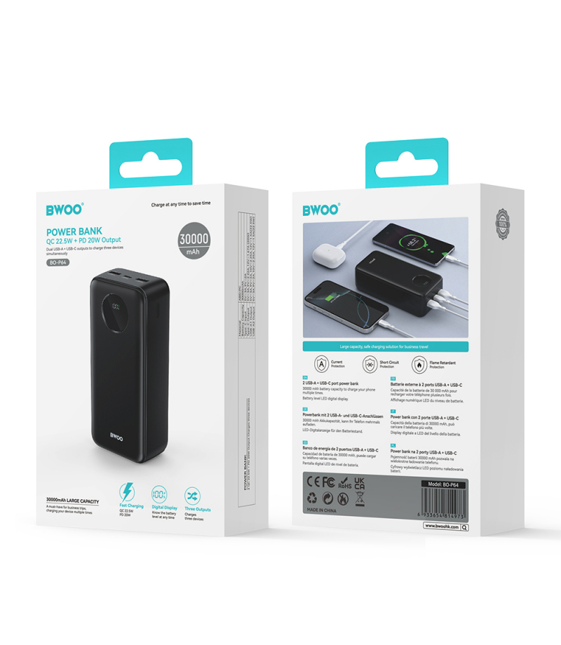 Ten powerbank o ogromnej pojemności 30000 mAh zapewnia wielokrotne ładowanie smartfonów, tabletów i innych urządzeń, co czyni go idealnym rozwiązaniem na długie podróże lub intensywne użytkowanie.