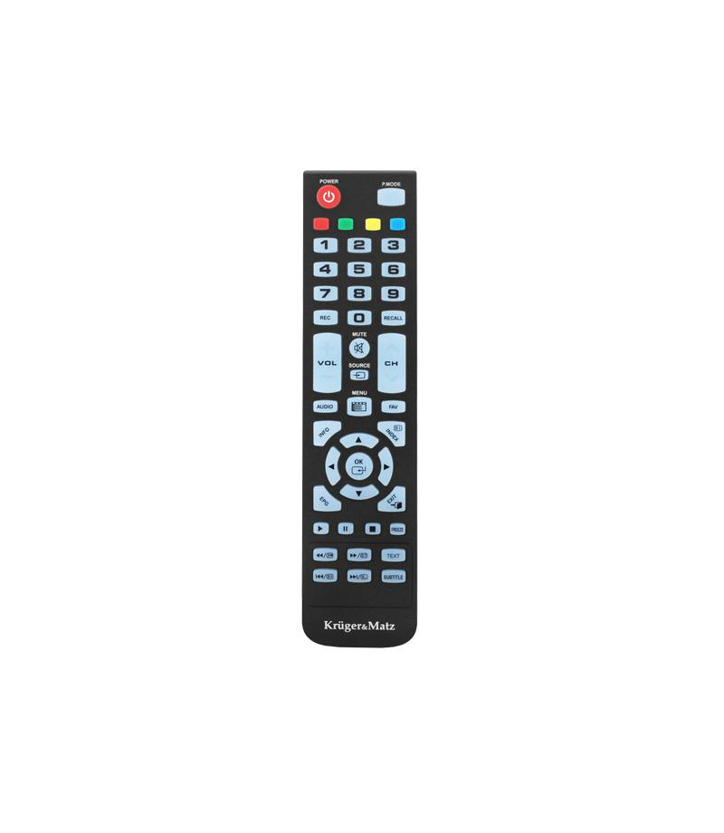 Pilot do TV LCD Kruger&Matz, VER.II. LAMEX LXKM0326 Pilot do TV LCD Kruger&Matz, VER.II. Pilot współpracujący z telewizorami Kruger&Matz wydanymi po 2015 roku. Kompatybilność: KM0232 KM0248 KM0250 KM0255UHD KM0265UHD Zasilanie: 2 x AAA