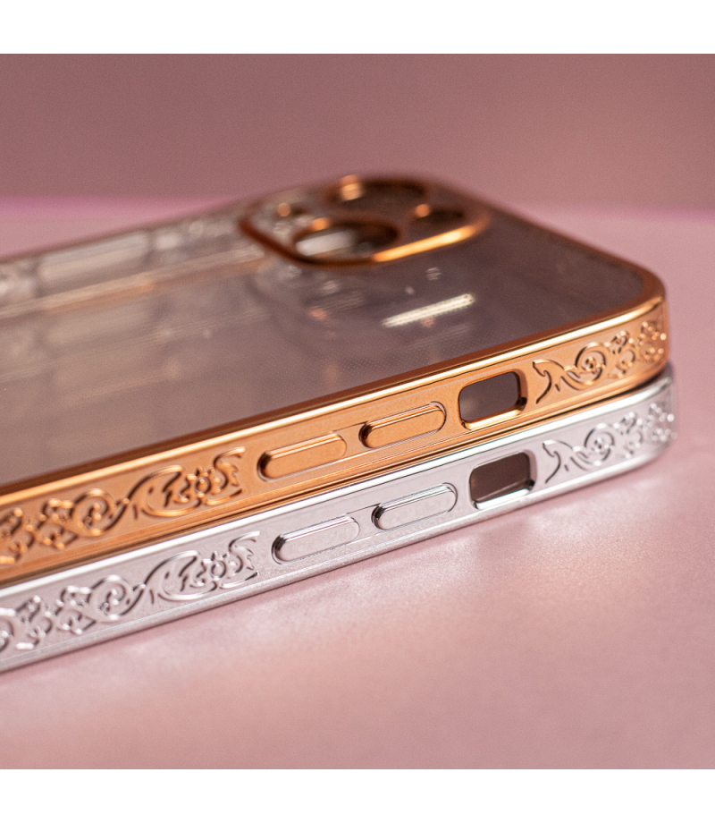 Nakładka Blink 2in1 do iPhone 13 Pro Max 6,7" złota Nakładka Blink 2in1 to produkt, którego wygląd zależy od użytkownika. Można wyjmować i wkładać transparentną, holograficzną wkładkę ze wzorem. Przyciąga spojrzenia metalicznym połyskiem. Tył jest przeźroczysty. Dodatkowo nakładkę wyróżnia bogato zdobiona ramka. Blink 2in1 ma wytłaczane ornamenty w srebrnym i złotym wariancie. W ramce znajdują się wytłoczenia na przyciski oraz otwory na smycz lub paski. Nakładka jest elastyczna i nie...