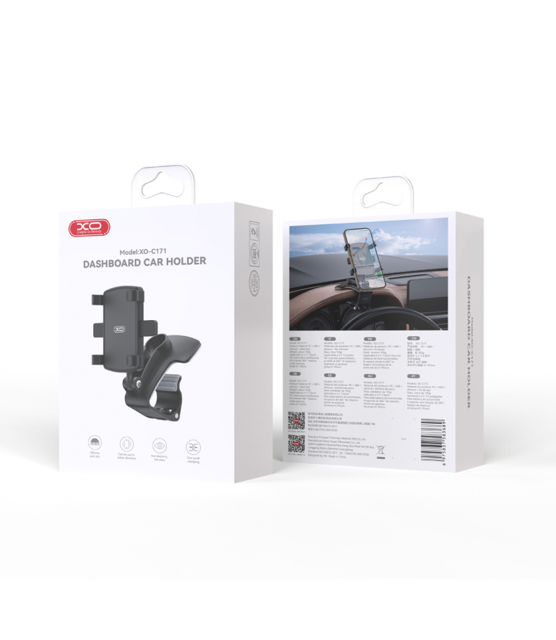Model produktu to XO-C171. Wykonany jest z materiałów PC, ABS, silikonu oraz stalowego drutu. Kąt obrotu wynosi 360°. Wymiary produktu to 105×100×96 mm z tolerancją ±2 mm. Waga wynosi około 103±3 gramów bez urządzenia. W zestawie znajduje się jeden uchwyt oraz jedna śrubokręt. Produkt jest przeznaczony do telefonów komórkowych o przekątnej ekranu od 4,7 do 7,6 cala. Uchwyt można dostosować do różnych modeli telefonów. Przeznaczony do montażu na desce rozdzielczej samochodu, umożliwia obrót o 360°, a szerokość rozwarcia uchwytu wynosi od 61 do 95 mm.