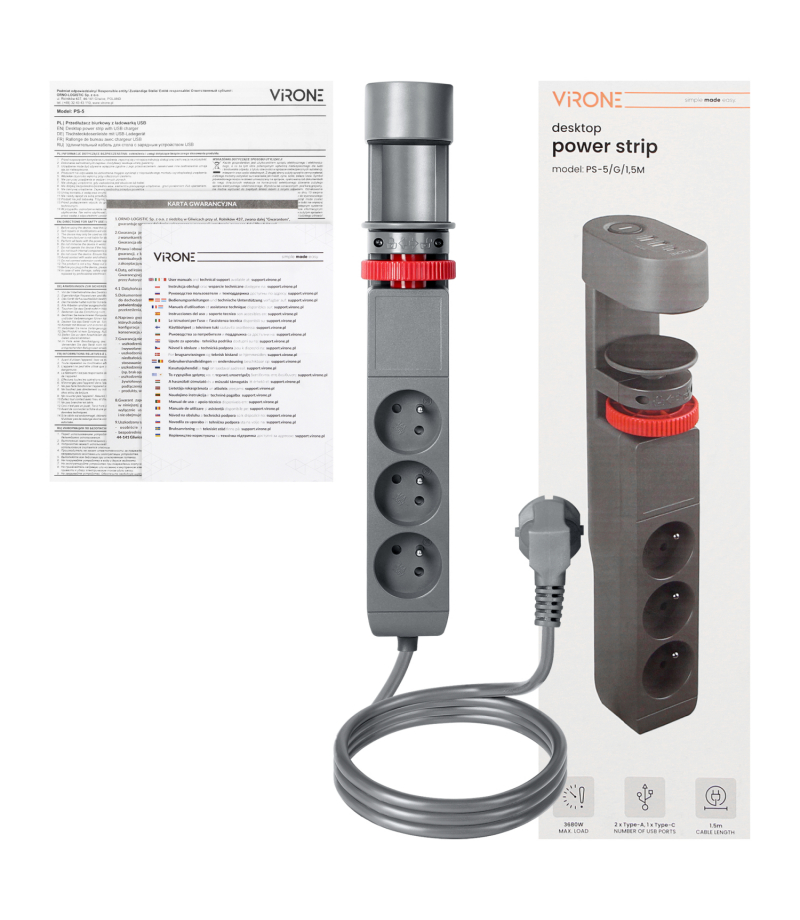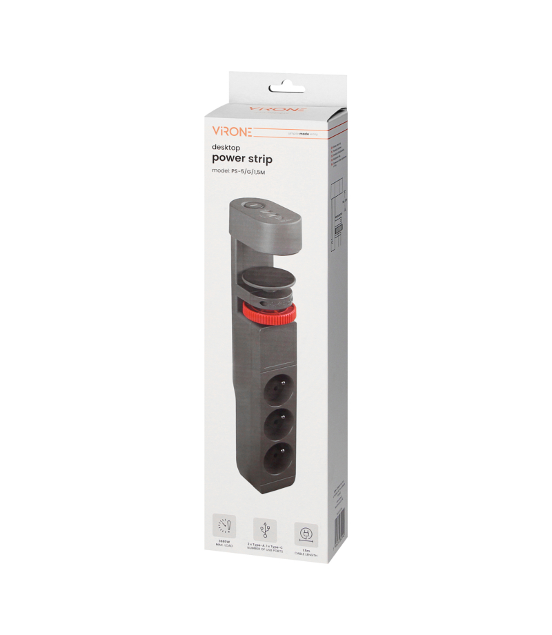 Przedłużacz biurkowy 3-krotny z ładowarką USB to funkcjonalne urządzenie elektryczne, które stanowi doskonałe rozwiązanie w miejscach, gdzie dostęp do gniazda sieciowego jest ograniczony. Swoje zastosowanie znajdzie na biurku, blacie roboczym czy w miejscach, gdzie wymagane jest jednoczesne podłączenie kilku urządzeń. Prąd znamionowy wynoszący 16A pozwala na zasilanie urządzeń o dużym poborze mocy, o max. obciążeniu 3680W. 3 gniazda sieciowe w standardzie francuskim 2P+Z pozwalają na podłączenie standardowych urządzeń, takich jak komputer czy sprzęt domowy, a wbudowana ładowarka USB (2xUSB-A i 1xUSB-C) umożliwia ładowanie aż 3 urządzeń mobilnych jednocześnie, takich jak: smartfon, tablet czy powerbank. Prąd znamionowy ładowarki USB na poziomie 3,4A pozwala na szybkie ładowanie urządzeń mobilnych. Dodatkowo, przedłużacz wyposażony jest w przełącznik włącz/wyłącz, co zwiększa komfort użytkowania i bezpieczeństwo, zwiększając kontrolę nad podłączonymi urządzeniami. Uchwyt montażowy umożliwia stabilne i bezpieczne zamocowanie przedłużacza na wybranej powierzchni roboczej, by zapobiec jego przesuwaniu się. Produkt wykonany jest z wysokiej jakości tworzywa sztucznego wykończonego matową powierzchnią w kolorze szarym. Jego korpus ma prostokątny kształt, a... Więcej szczegółów