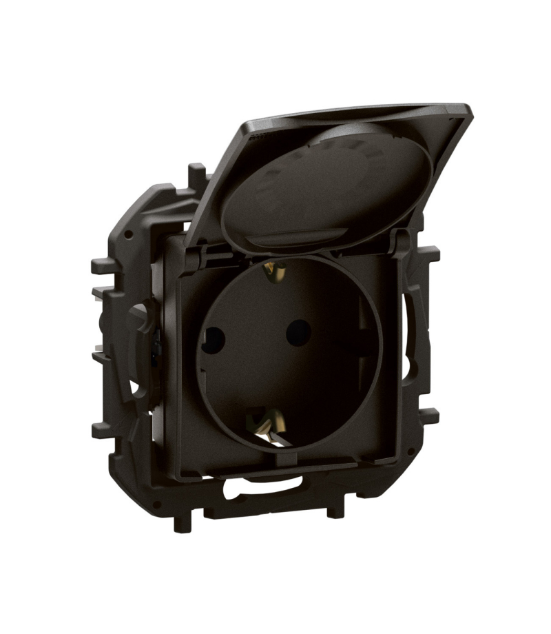 Gniazdo Schuko 2P+Z z przesłoną i klapką z serii Nowe Niloe umożliwia podłączenie urządzeń elektrycznych lub elektronicznych. Zaciski śrubowe. Mechanizm wymaga uzupełnienia o ramkę. Mechanizm z pazurkami. Solidny plastikowy uchwyt podtynkowy zapewnia wysoką sztywność i odporność. System nacięć ułatwia montaż w konfiguracji wielokrotnej, a uchwyty podtynkowe idealnie się łączą, co usprawnia instalację. Zwiększa bezpieczeństwo w domu, ponieważ styki elektryczne nie są dostępne, gdy wtyczka nie jest podłączona, nawet jeśli osłona nie jest zamontowana. Klapa otwiera się o maksymalnie 180°. Produkt przeznaczony jest wyłącznie do użytku wewnętrznego. Kolor - czarny matowy.