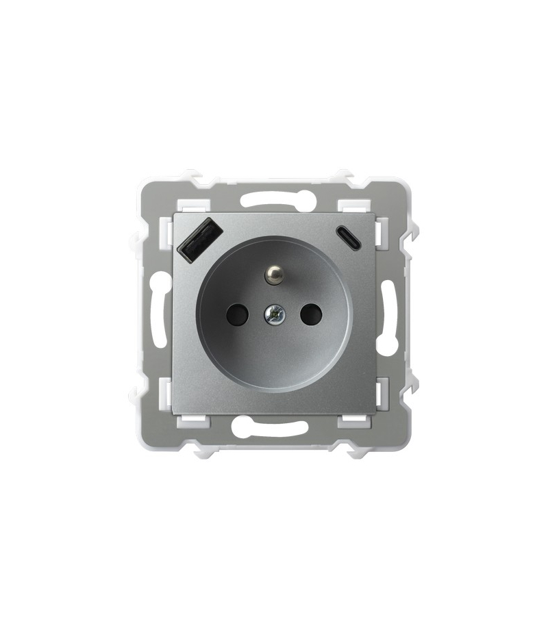 SZAFIR GP-1ZZPUSBAC/m/18 Gniazdo pojedyncze z uziemieniem z przesłonami torów prądowych z ładowarką, USB A+C Srebro Ospel Producent: OSPEL Seria: SZAFIR Osprzęt: Podtynkowy Kolor: Srebro Nr katalogowy: GP-1ZZPUSBAC/m/18 EAN: 5906729031750 Dane techniczne: 16A 250V~, IP20, zaciski bezgwintowe...