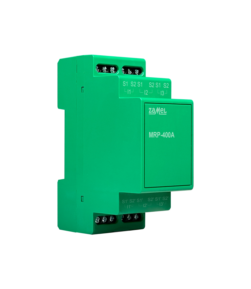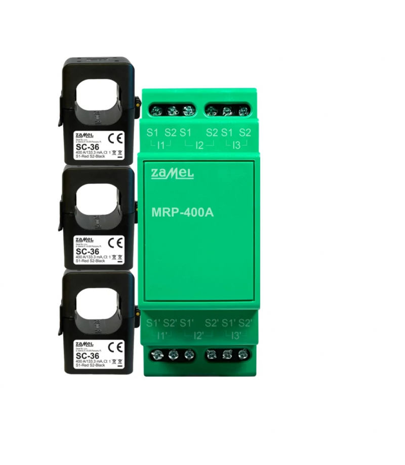 Moduł MRP-400A daje możliwość monitorowania sieci elektrycznej, gdzie natężenie prądu wynosi do 400 A. Urządzenie sprzedawane jest w komplecie z przekładnikami prądowymi SC-36 (400A).