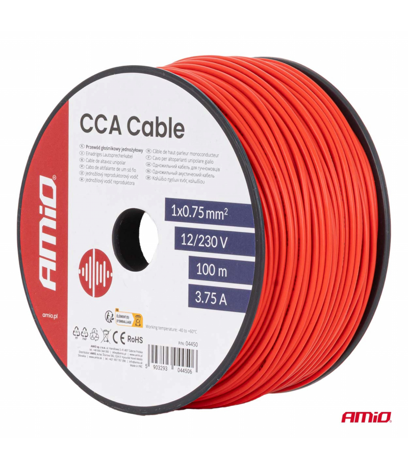 Przewód jednożyłowy czerwony CCA 1x0.75mm2 100m 3.75A 12/230V AMIO-04450 Jednożyłowy przewód instalacyjny w technologii CCA (Copper Clad Aluminium), przeznaczony do lekkich instalacji elektrycznych niskiego i sieciowego napięcia. Przekrój 1x0.75 mm² zapewnia bezpieczną pracę przy prądzie do 3.75 A. Rolka 100 m umożliwia ekonomiczne prowadzenie przewodów w domach, pojazdach i małych projektach przemysłowych, a czerwony kolor izolacji ułatwia identyfikację przewodu w...