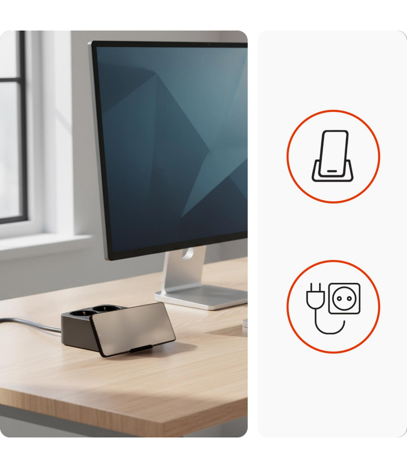Otwory montażowe + uchwyt na telefon – większa wygoda użytkowania. Możliwość montażu na ścianie lub pod biurkiem oraz funkcja stojaka na smartfona. Zapewnia porządek, komfort i funkcjonalność w jednym.