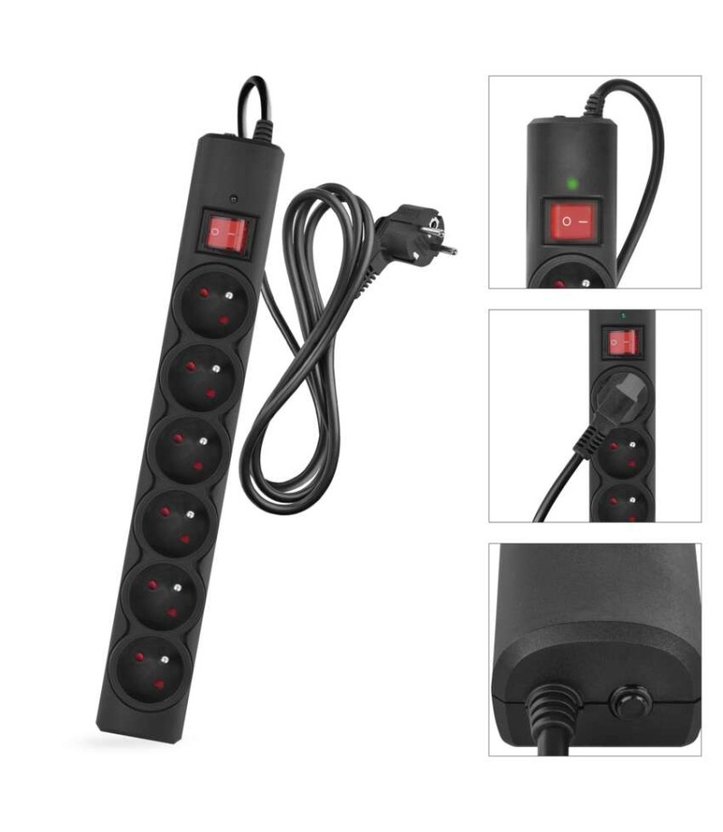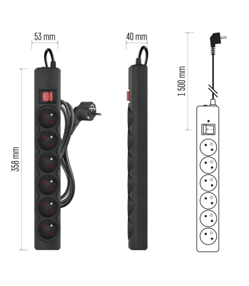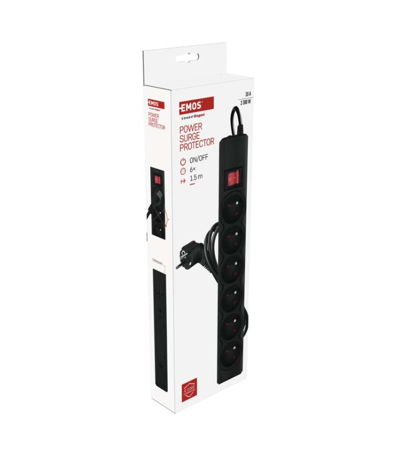 Listwa przeciwprzepięciowa EMOS, 6 gniazd, 1,5m, bezpiecznik 10A, Gwarancja 2000€, czarna EMOS P54018 Absorpcja energii: 380 J L-N Bezpiecznik: bezpiecznik 10 A / 250 V~ Czas reakcji: 1 ns Długość: 1,5 m Filtr EMI/RFI: nie Gwarancja: 2 000 € Ilość gniazd: 6× 2P + PE...