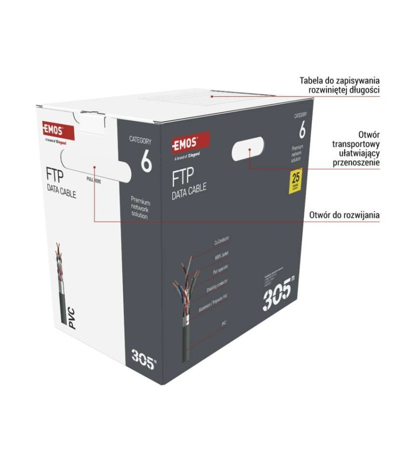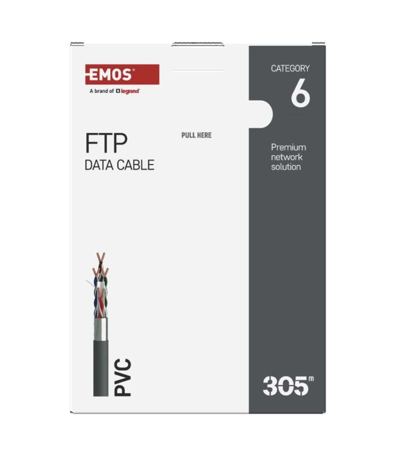 Kabel FTP Cat6, pudełko 305m, pełna miedź (Cu) EMOS S9231 AWG: 23 Długość: 305 m Ekran: nie Grubość izolacji przewodów: 0,21 mm Grubość płaszcza: 1,0 mm Ilość przewodów: 8 Izolacja żył: HDPE Kategoria: CAT6 Klasa reakcji na ogień: Eca...