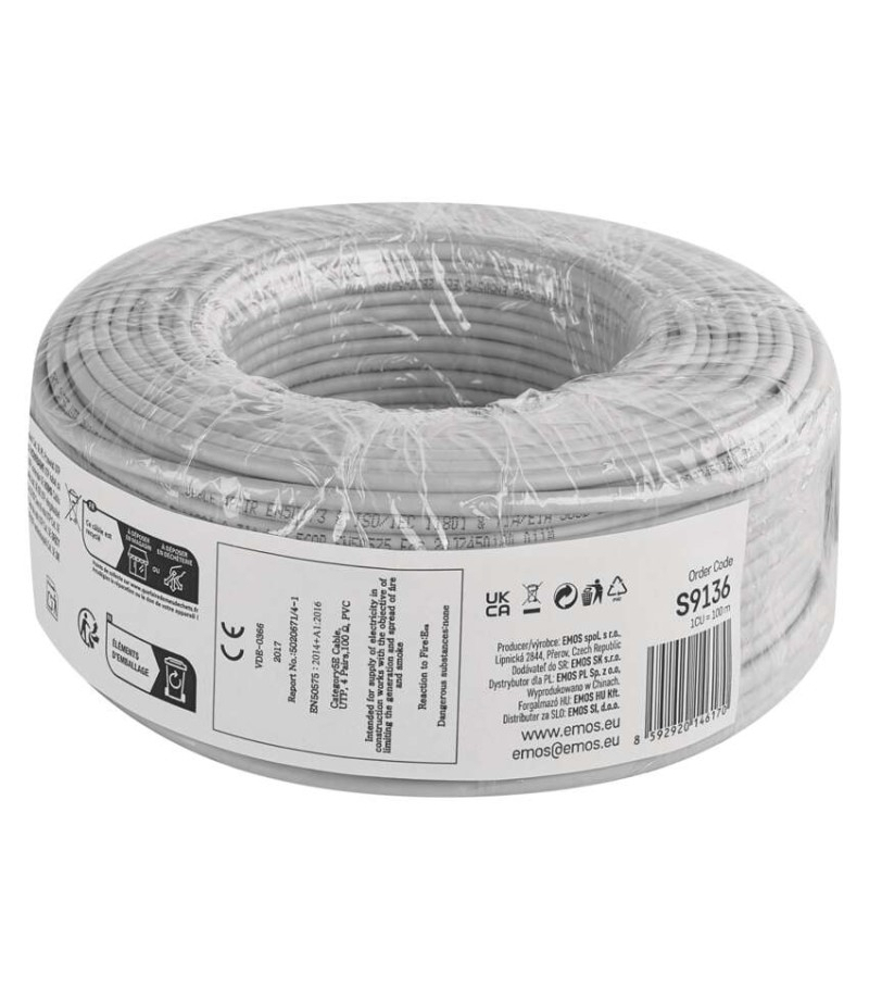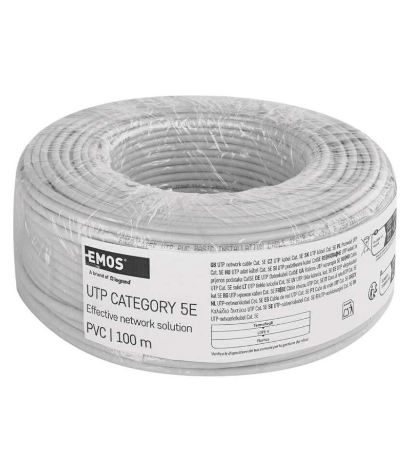 Kabel UTP Cat5e PVC Basic, krążek 100m, miedź (Cu) EMOS S9136 AWG: 24 Długość: 100 m Ekran: nie Grubość izolacji przewodów: 0,21 mm Grubość płaszcza: 1,0 mm Ilość przewodów: 8 Izolacja żył: HDPE Kategoria: CAT5E Klasa reakcji na ogień: Eca Kolor płaszcza: szary (RAL 7035) Maksymalna wilgotność robocza: 93 % Materiał żyły wewnętrznej: miedź (Cu) Najwyższy obsługiwany protokół: 1000 Base-T (Gigabit...
