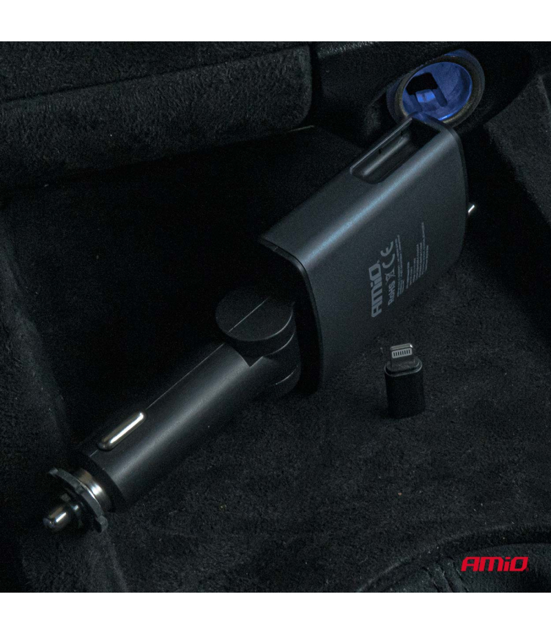 Transmiter samochodowy FM 1×USB-A 1×USB-C 12V 24V AMIO-04656 Wielofunkcyjny transmiter FM z modułem Bluetooth i wbudowanym, wysuwanym kablem USB-C, który ułatwia ładowanie urządzeń bez konieczności używania dodatkowych przewodów. Umożliwia odtwarzanie muzyki oraz prowadzenie rozmów telefonicznych w trybie głośnomówiącym. Cechy produktu: 1× port USB-A – do ładowania urządzeń lub odtwarzania muzyki z...