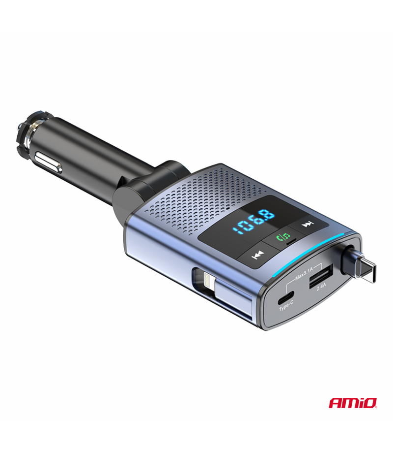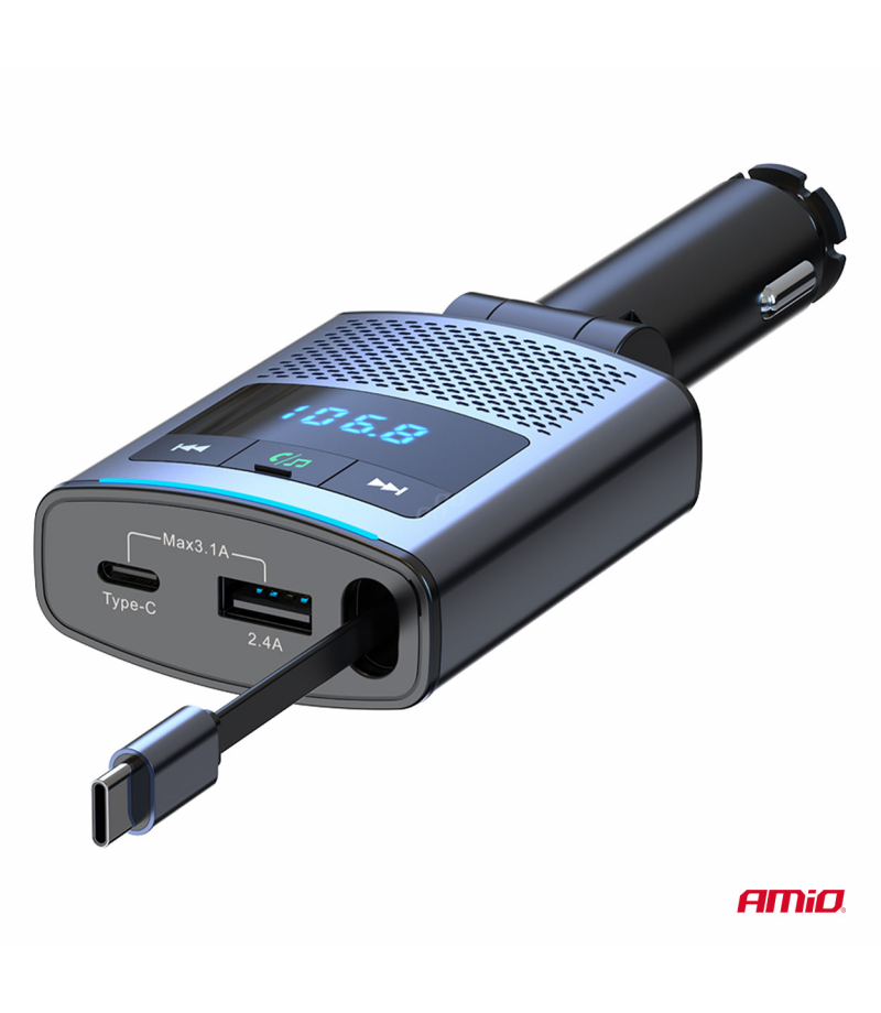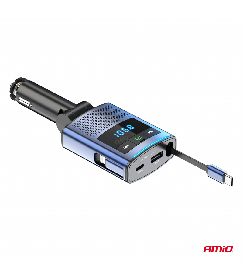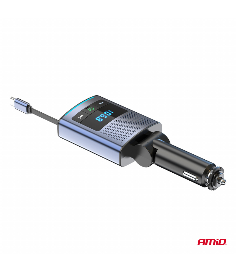 Wielofunkcyjny transmiter FM z modułem Bluetooth i wbudowanym, wysuwanym kablem USB-C, który ułatwia ładowanie urządzeń bez konieczności używania dodatkowych przewodów. Umożliwia odtwarzanie muzyki oraz prowadzenie rozmów telefonicznych w trybie głośnomówiącym.
