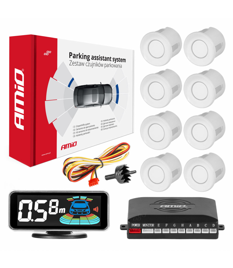 Zestaw zawiera niezbędne elementy montażowe : wiertło z otwornicą, okablowanie takie jak przewód zasilający i przewody czujników, a także centralkę zasilającą, sensory oraz wyświetlacz lub buzzer w zależności od zestawu. Dzięki intuicyjnemu montażowi i elementom mocującym w łatwy i szybki sposób samodzielnie zamontujesz system wspomagania parkowania.