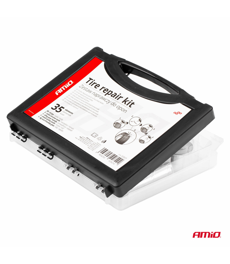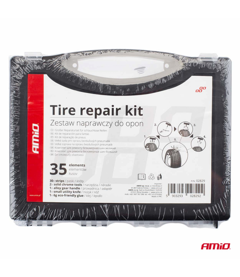 Zestaw do naprawy opon samochodowych. Komplet jest prosty w obsłudze i uniwersalny. Umożliwia naprawę opony w kilka minut.