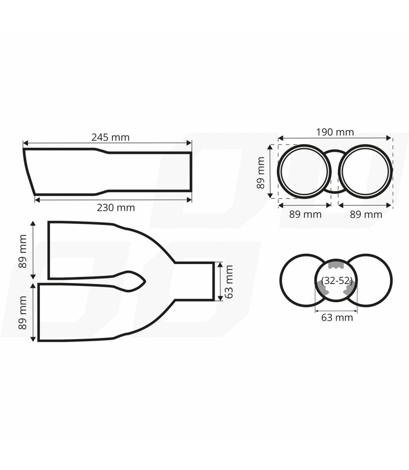 Końcówka uniwersalna nadająca elegancki sportowy wygląd. Poprzez szeroki zakres regulacji uchwytów pasuje do większości samochodów (dwa sposoby montażu: do przykręcenia za pomocą śrub montażowych lub do przyspawania).