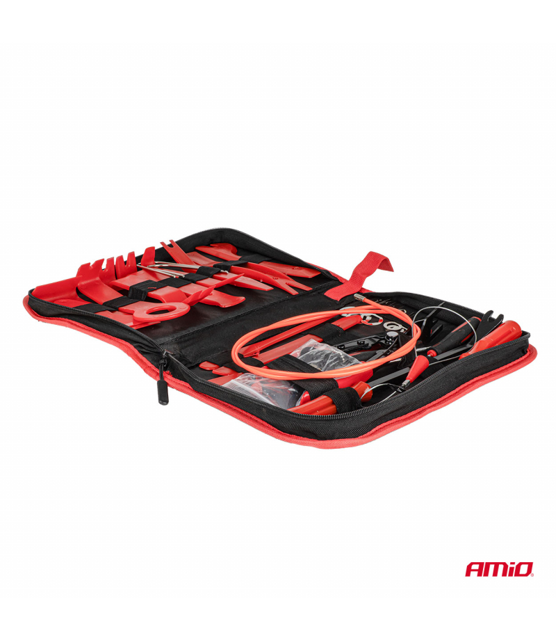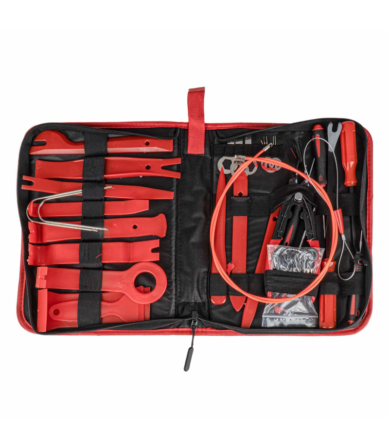 Profesjonalny zestaw 40 narzędzi przeznaczonych do demontażu elementów tapicerki, paneli, listew, osłon plastikowych oraz sprzętu audio w samochodzie. Zestaw umożliwia szybki, precyzyjny i bezpieczny demontaż bez ryzyka uszkodzenia elementów nadwozia i wnętrza.