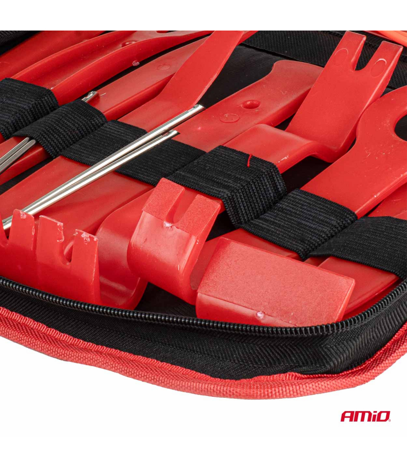 Ściągacze do radia, tapicerki i klipsów zestaw duży z torbą 40szt. AMIO-04747 Profesjonalny zestaw 40 narzędzi przeznaczonych do demontażu elementów tapicerki, paneli, listew, osłon plastikowych oraz sprzętu audio w samochodzie. Zestaw umożliwia szybki, precyzyjny i bezpieczny demontaż bez ryzyka uszkodzenia elementów nadwozia i wnętrza. Narzędzia wykonane z trwałego, odpornego na złamania tworzywa, odpornego na odkształcenia. Zestaw...