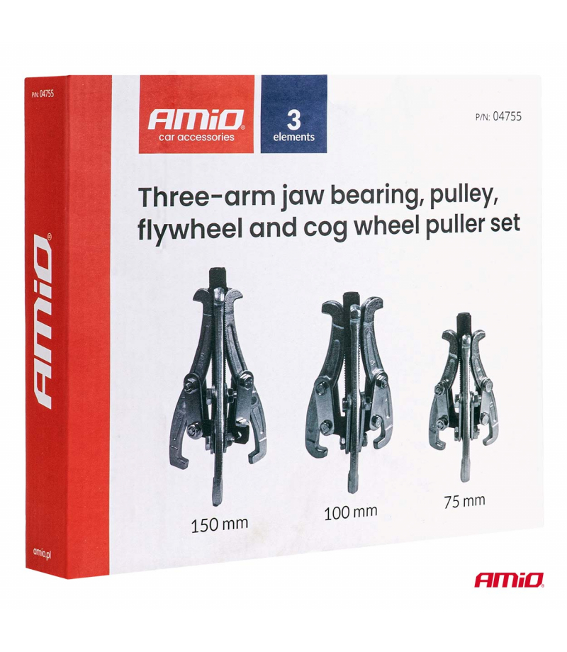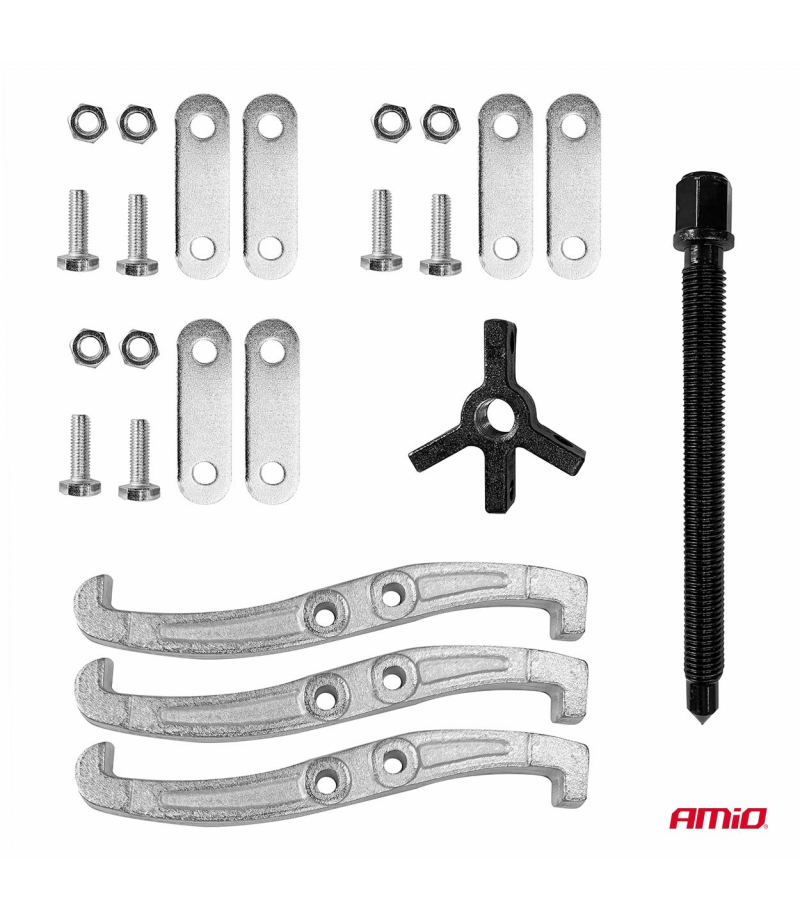 Zestaw trójramiennych ściągaczy do łożysk oraz kół pasowych, zębatych i zamachowych AMIO-04755 Profesjonalny zestaw trójramiennych ściągaczy przeznaczony do bezpiecznego demontażu łożysk, kół pasowych, kół zębatych oraz zamachowych w pojazdach i maszynach przemysłowych. Trójramienna konstrukcja zapewnia równomierne rozłożenie siły, co minimalizuje ryzyko uszkodzenia elementów obracających się i sąsiadujących części....