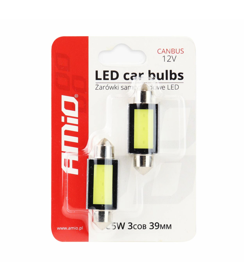 Wymiary - 39/14mm (dł/szer) Barwa - 5600 K Dioda LED - 3 x COB Pobór mocy - 2,4W Napięcie - 12V Bipolarna Typ żarówki: C5W C10W Napięcie [V]: 12 Ilość w opakowaniu [szt.]: 2 Producent: AMiO Nr katalogowy: 01640 Kod kreskowy EAN: 5903293016404 Wymiary opakowania: 2cm x 6cm x 9cm Waga: 0.0140kg Stawka VAT: 23.00% Karton zbiorczy zawiera: 100/1000szt.