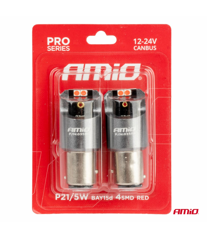 Żarówki samochodowe LED marki AMiO są nowoczesnym rozwiązaniem wykorzystującym technologie diod LED. Użyte diody emitują czerwoną barwę światła oraz są pozbawione efektu mrugania. Wysoka jakość wykonania gwarantuje żywotność żarówek do 50 000 godzin, a specjalny układ zasilania nie wymaga przerabiania instalacji elektrycznej w samochodzie umożliwiając bezproblemowy montaż w tradycyjnych oprawach świetlnych, gdzie wcześniej były wykorzystywane zwykłe żarówki.