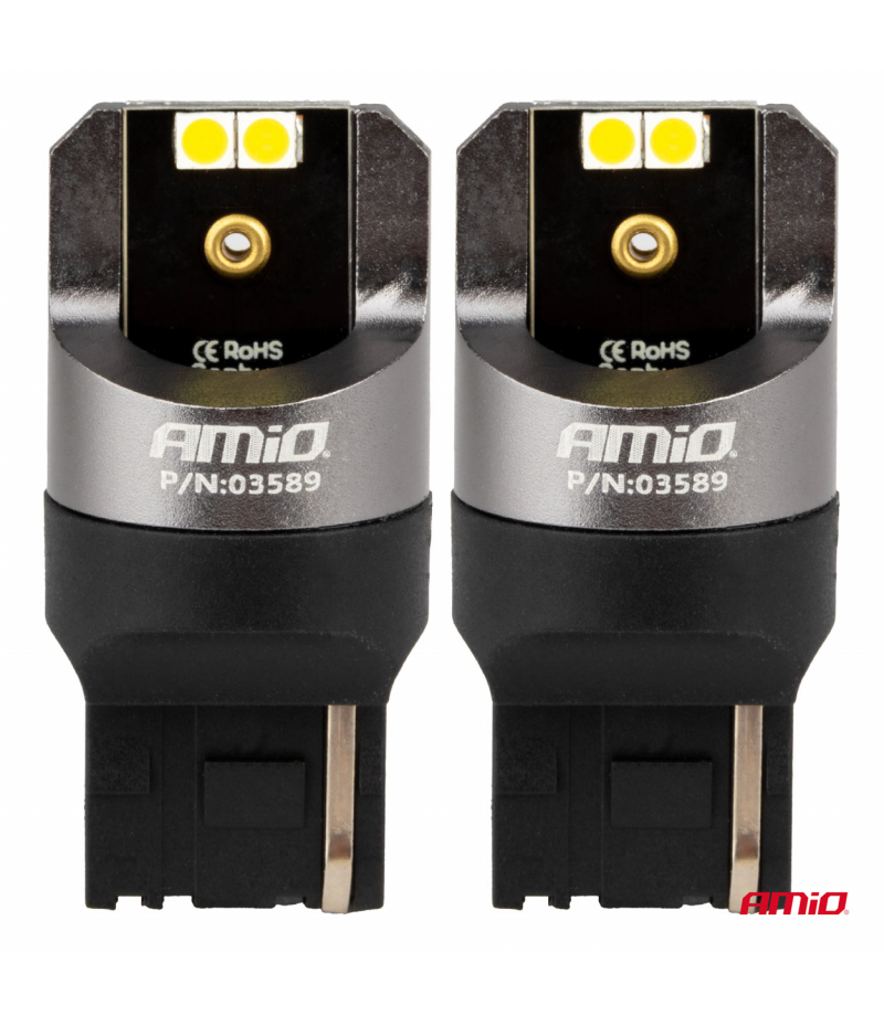 Żarówki samochodowe LED marki AMiO są nowoczesnym rozwiązaniem wykorzystującym technologie diod LED. Użyte diody emitują białą barwę światła oraz są pozbawione efektu mrugania. Wysoka jakość wykonania gwarantuje żywotność żarówek do 50 000 godzin, a specjalny układ zasilania nie wymaga przerabiania instalacji elektrycznej w samochodzie umożliwiając bezproblemowy montaż w tradycyjnych oprawach świetlnych, gdzie wcześniej były wykorzystywane zwykłe żarówki.