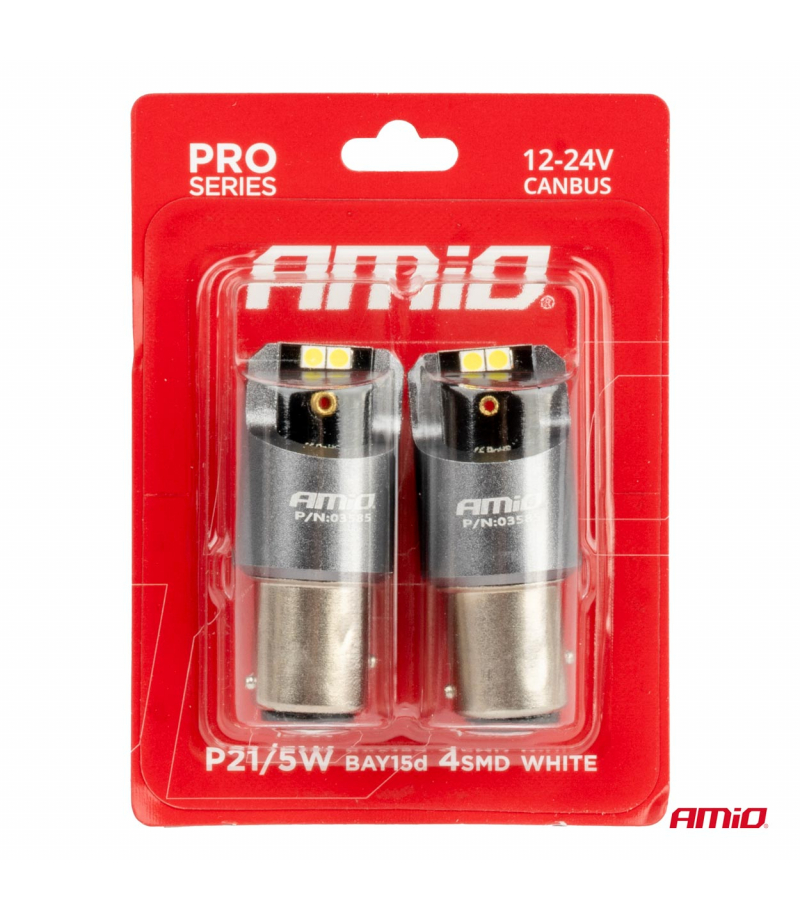 Żarówki samochodowe LED marki AMiO są nowoczesnym rozwiązaniem wykorzystującym technologie diod LED. Użyte diody emitują białą barwę światła oraz są pozbawione efektu mrugania. Wysoka jakość wykonania gwarantuje żywotność żarówek do 50 000 godzin, a specjalny układ zasilania nie wymaga przerabiania instalacji elektrycznej w samochodzie umożliwiając bezproblemowy montaż w tradycyjnych oprawach świetlnych, gdzie wcześniej były wykorzystywane zwykłe żarówki.