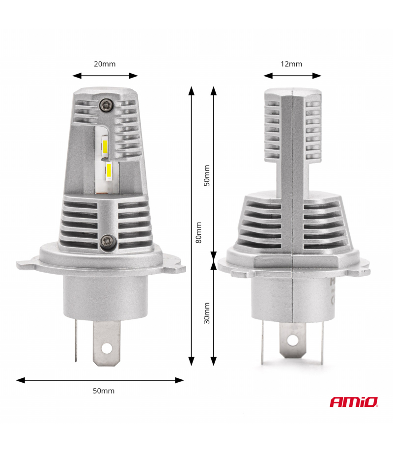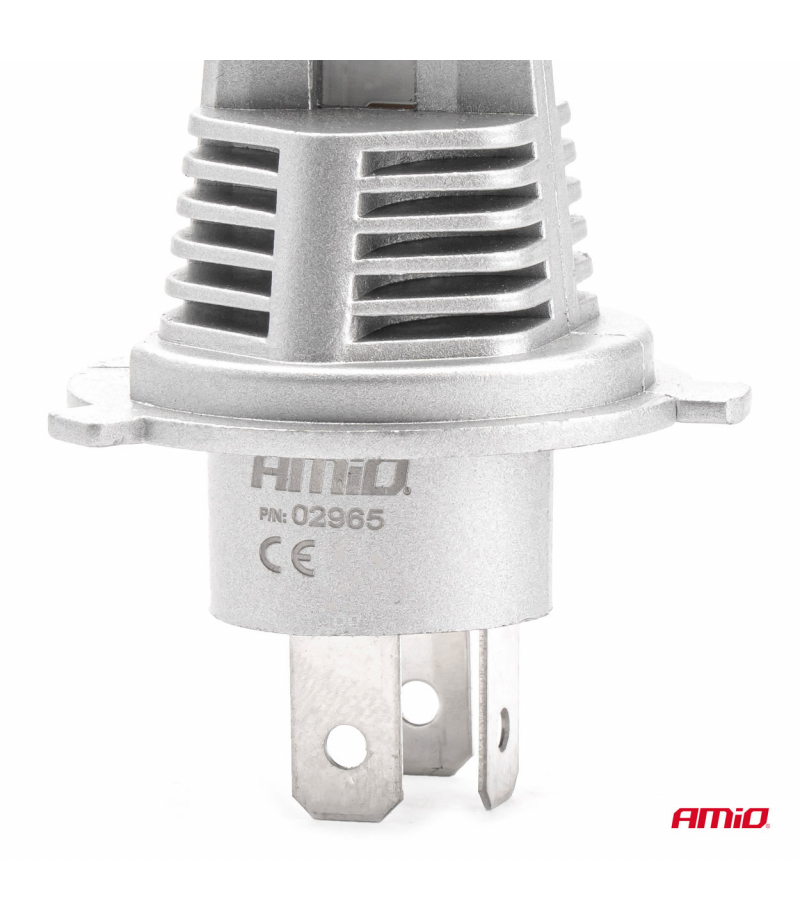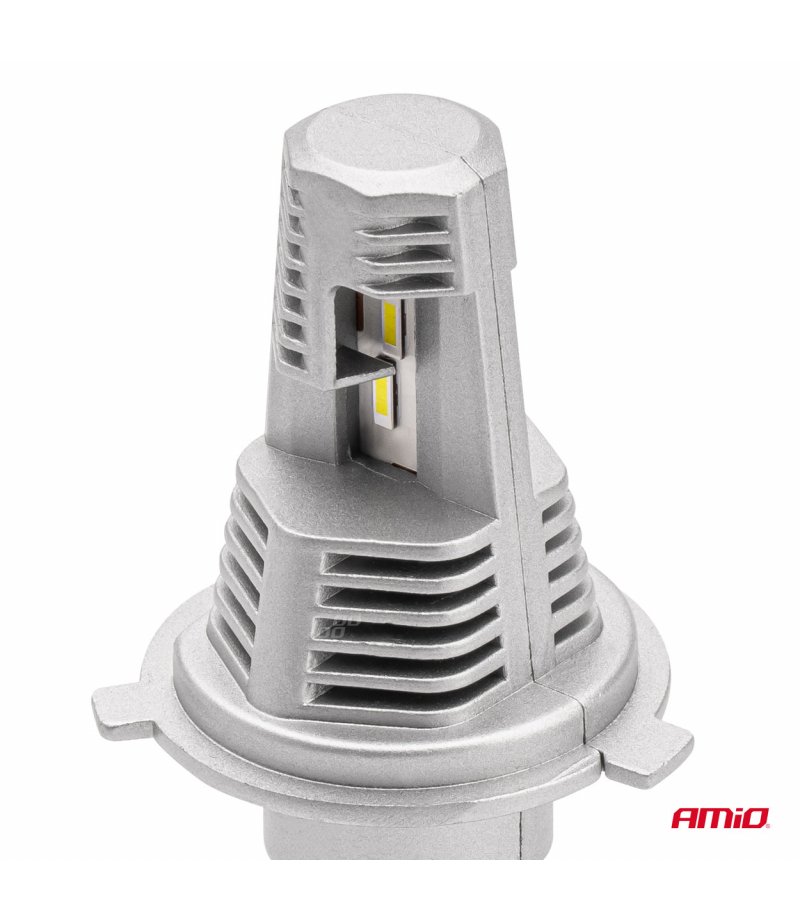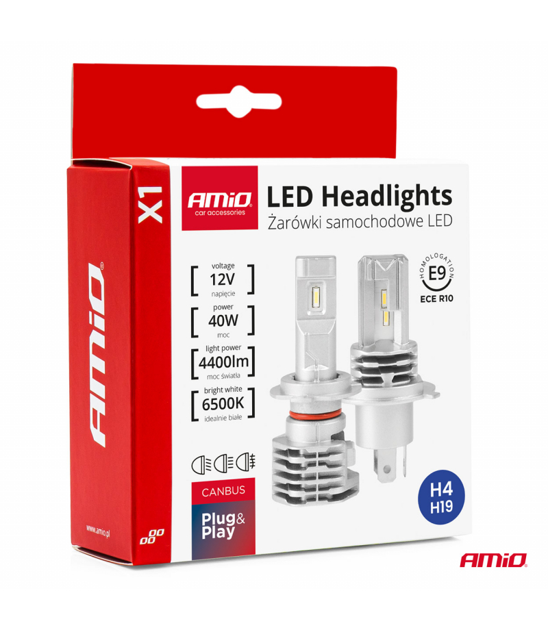 Żarówki LED H4/H19 AMiO seria X1 charakteryzują się bardzo wysoką jakością wykonania. Proponowany zestaw emituje jaśniejsze i bardziej skoncentrowane światło, co pozwala na lepszą widoczność drogi w warunkach ograniczonego oświetlenia, takich jak zmrok, mgła lub deszcz. Źródła światła wykonane w technologii CSP są efektywniejsze w procesie przemiany energii elektrycznej na światło widzialne w porównaniu do tradycyjnych żarówek halogenowych. Żarówki LED są bardziej odporne na wstrząsy i drgania, co oznacza, że mają dłuższą żywotność niż żarówki halogenowe.