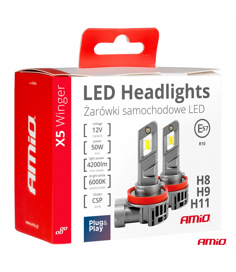 ŻARÓWKI LED AMiO X5 WINGER IDEALNIE DOPASOWANE 1 DO 1 Rozmiar jest taki sam jak standardowej żarówki. Zamiennik żarówki H8 , H9 , H11 Idealnie dopasowany model - zapomnij o problemach z montażem, przeróbkach, nie zamkniętych parujących reflektorach, przycinaniu obudowy i adapterach. W budowie zastosowano takie materiały jak aluminium i miedź, zapewnia wyjątkową żywotność i skuteczne odprowadzanie ciepła Optymalna geometria i rozmieszczenie diód...