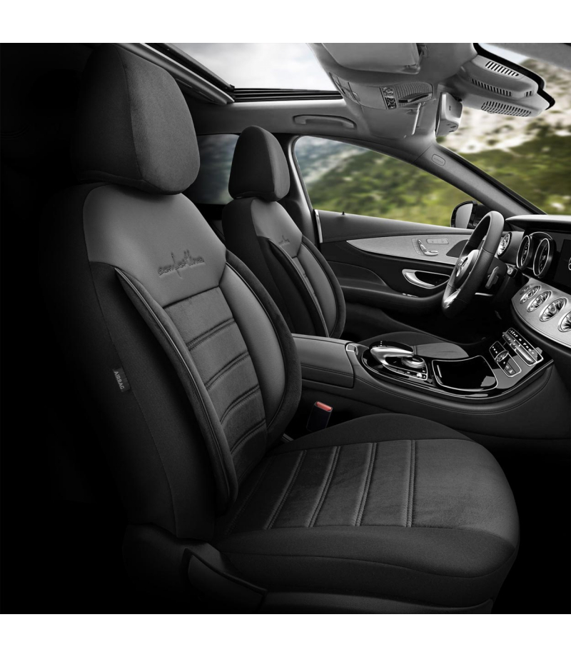 Pokrowce posiadają zamki w tylnej kanapie, dzięki czemu pasują do większości siedzeń dostępnych na rynku, (kanap niedzielonych, dzielonych prawo jak i lewostronnie). Możemy bez problemu złożyć oparcia, aby zwiększyć przestrzeń bagażową.