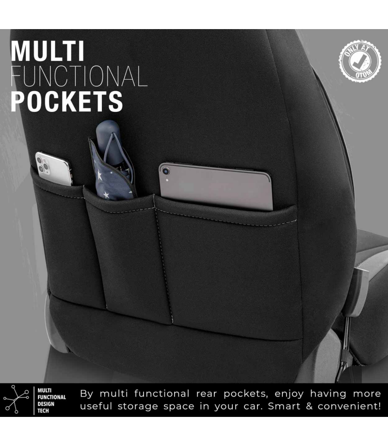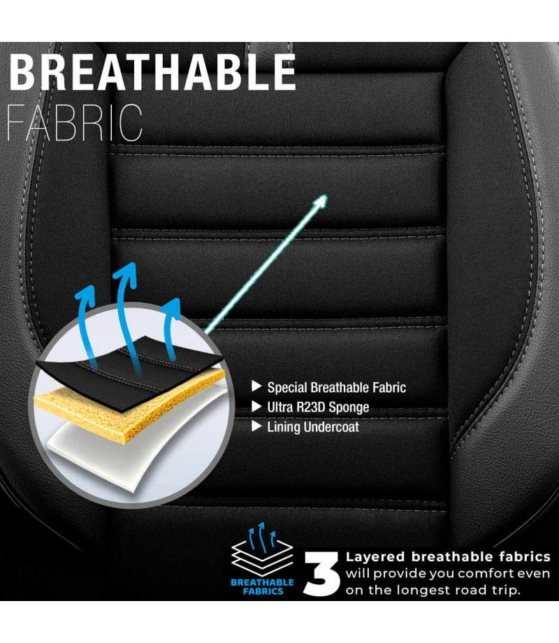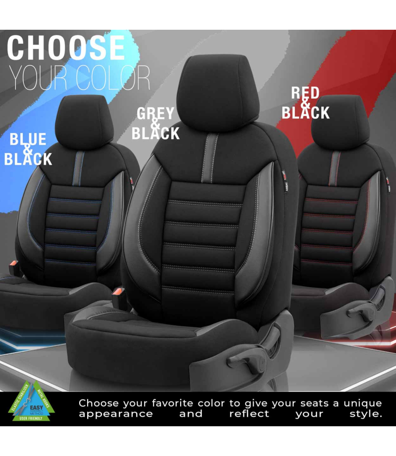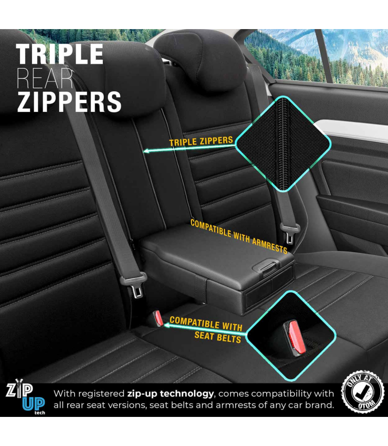 Pokrowce posiadają zamki w tylnej kanapie, dzięki czemu pasują do większości siedzeń dostępnych na rynku, (kanap niedzielonych, dzielonych prawo jak i lewostronnie). Możemy bez problemu złożyć oparcia, aby zwiększyć przestrzeń bagażową.