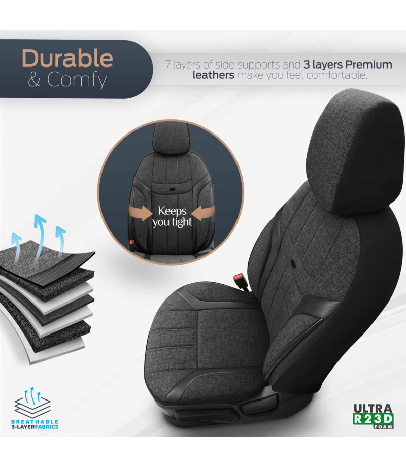 Produkt stworzony z najwyższej jakości tkanin tapicerskich. Połączenie najlepszych materiałów oraz wysoka dbałość o detale podczas wykonania zapewnia ekskluzywny wygląd oraz wyjątkową trwałość, a także doskonałą ochronę foteli przed zabrudzeniami i przetarciami.