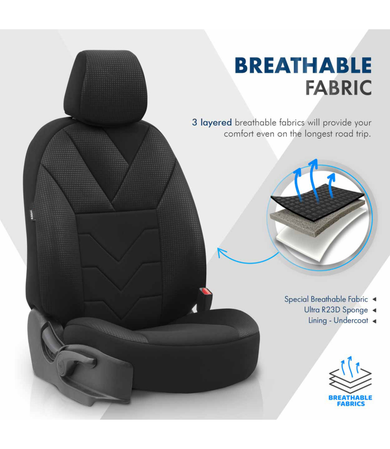Produkt stworzony z najwyższej jakości tkanin tapicerskich. Połączenie najlepszych materiałów oraz wysoka dbałość o detale podczas wykonania zapewnia ekskluzywny wygląd oraz wyjątkową trwałość, a także doskonałą ochronę foteli przed zabrudzeniami i przetarciami.