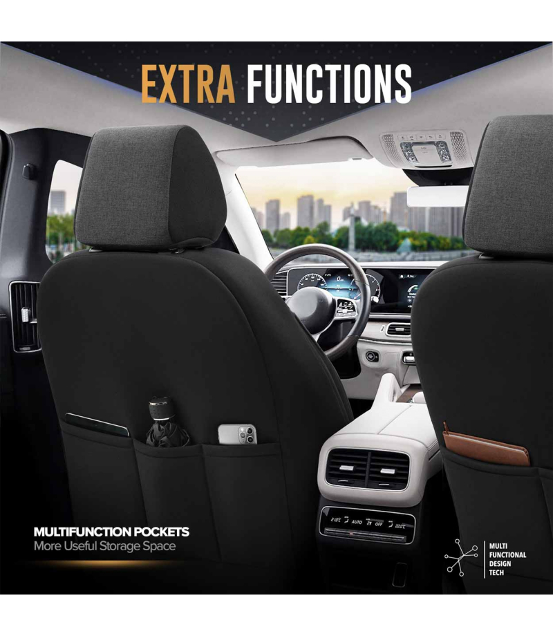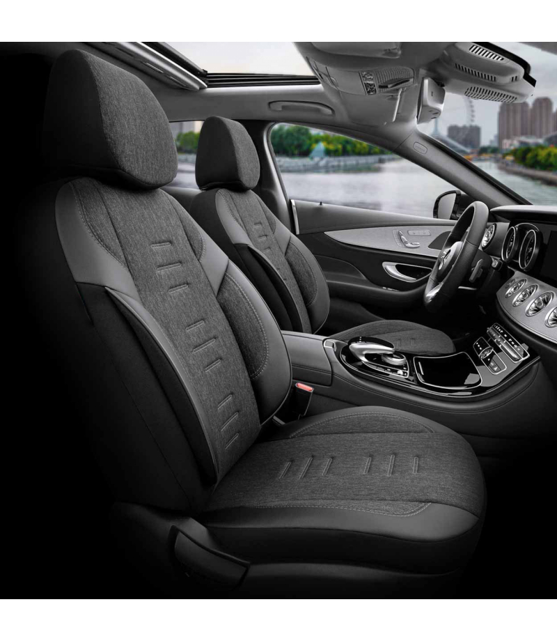 Pokrowce posiadają zamki w tylnej kanapie, dzięki czemu pasują do większości siedzeń dostępnych na rynku, (kanap niedzielonych, dzielonych prawo jak i lewostronnie). Możemy bez problemu złożyć oparcia, aby zwiększyć przestrzeń bagażową.