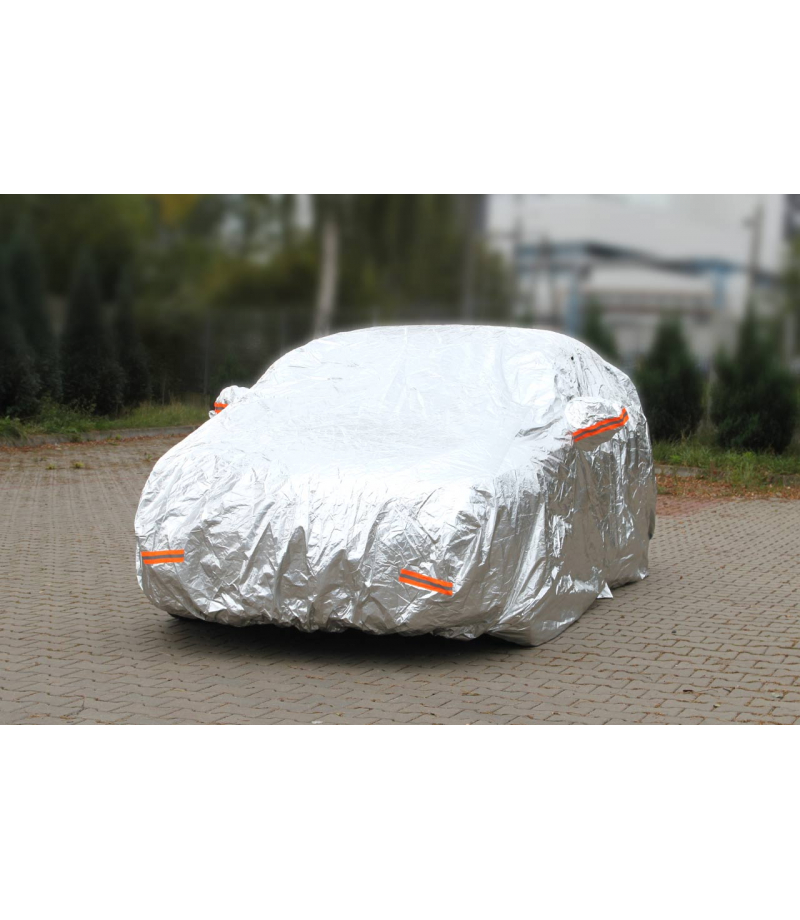 Plandeka na samochód typu SUV/VAN w rozmiarze XL 510x185x150cm Wysokiej jakości plandeka, która może być używana zarówno w zimie jak i w lecie, wykonana z odpornego na warunki atmosferyczne materiału o gramaturze 120g/m2 pokrytego filmem odblaskowym, który doskonale odbija promienie słoneczne. Warstwa wewnętrzna plandeki wykonana jest z miękkiej bawełny, która chroni lakier przed zarysowaniem. Plandeka posiada zamek błyskawiczny umożliwiający dostęp do samochodu bez zdejmowania...