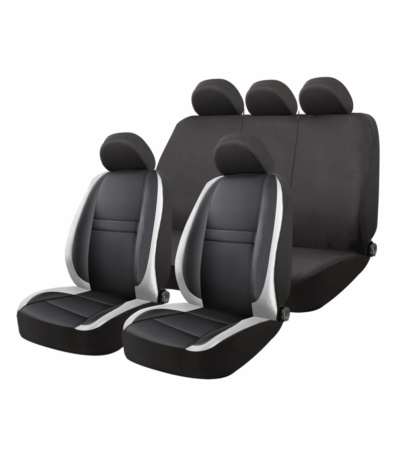 Zestaw 9-częściowy obejmuje pokrowce na dwa fotele przednie, tylną kanapę dzieloną oraz komplet zagłówków. Uniwersalne dopasowanie do większości modeli samochodów osobowych.