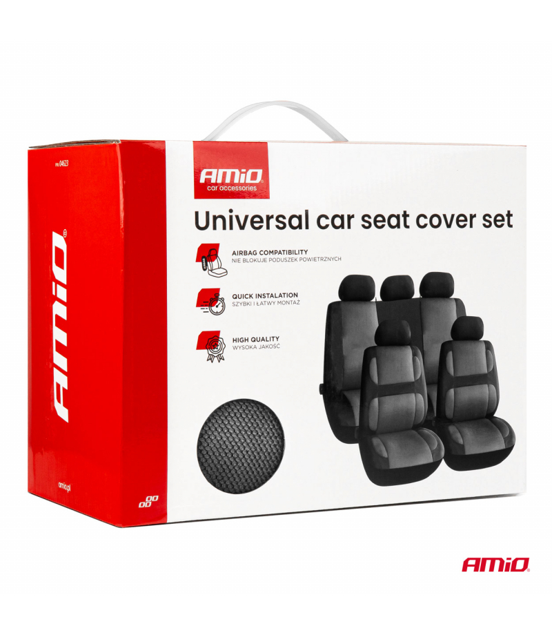 Pokrowce samochodowe na fotele uniwersalne przód tył komplet SC23 AMIO-04623 Kompletny zestaw pokrowców samochodowych na przód i tył pojazdu osobowego. Wykonane z wytrzymałego materiału o wysokiej odporności na przetarcia i zabrudzenia. Pokrowce przystosowane do siedzeń z poduszkami powietrznymi – nie blokują ich działania. Posiadają otwory na zagłówki i pasy bezpieczeństwa. Tylne części pokrowców w pełni kryte, co zapewnia ochronę całych przednich foteli, estetyczny...