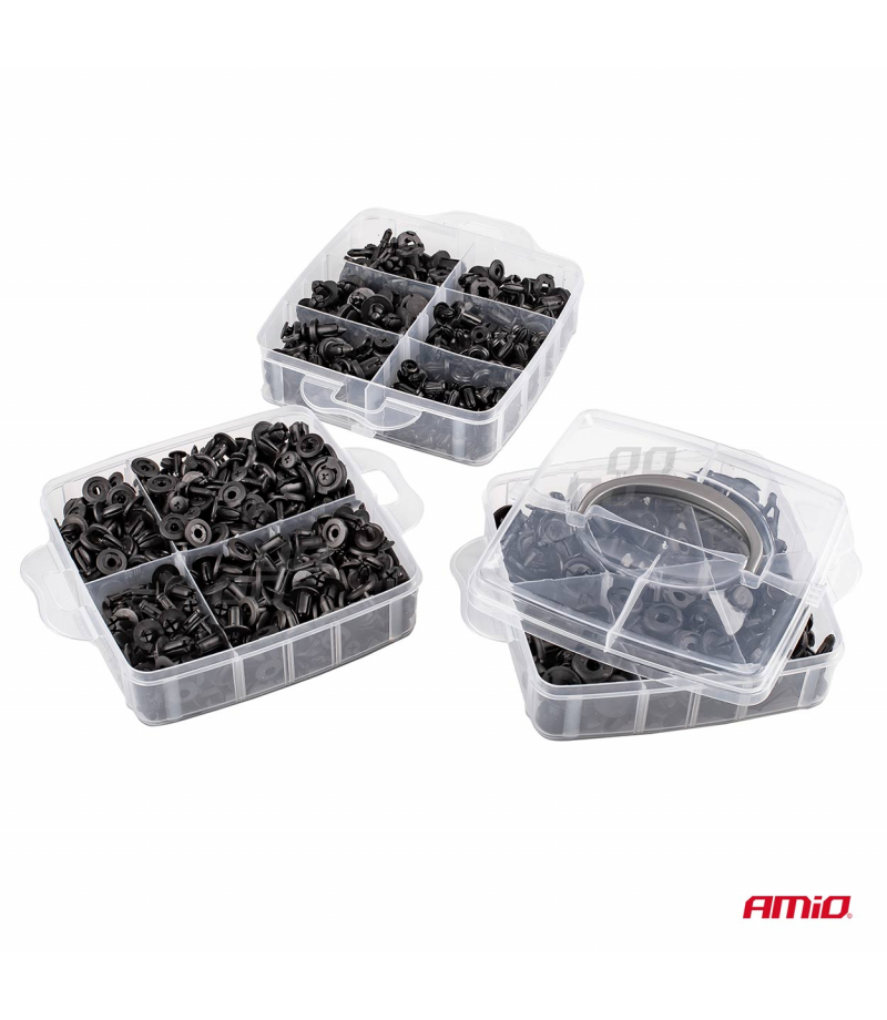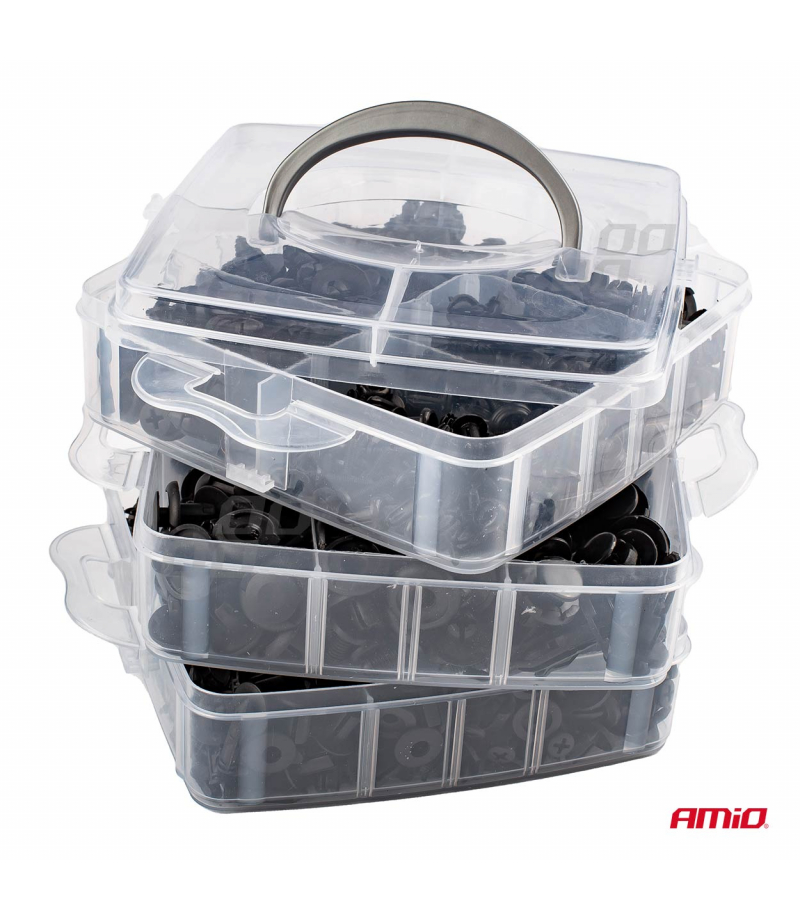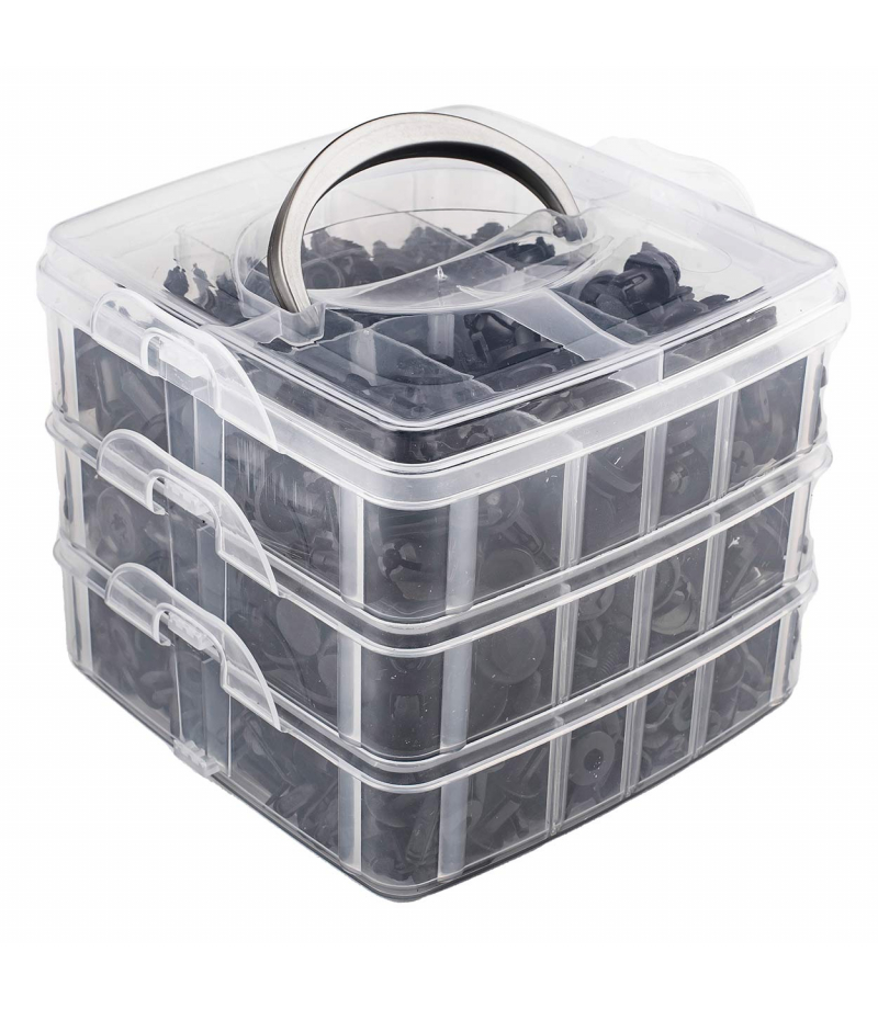 Zestaw 620 ELEMENTÓW, w skład którego wchodzi 16 najpopularniejszych rozmiarów klipsów i łączników mocujących.