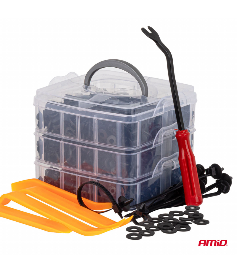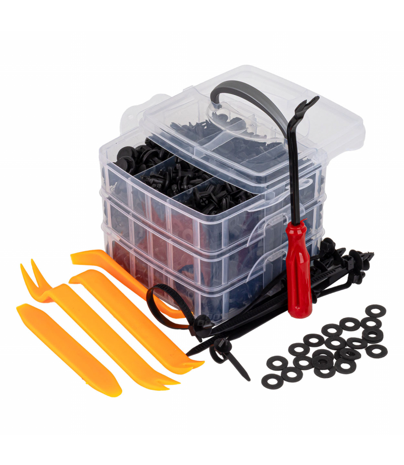 Spinki samochodowe kołki klipsy ściągacz do tapicerki 650el. AMIO-04433 Profesjonalny zestaw spinek i narzędzi do demontażu tapicerki samochodowej i elementów wykończeniowych. Zestaw obejmuje 650 elementów, w tym różnorodne spinki montażowe oraz specjalistyczne ściągacze, co umożliwia szybki i bezpieczny demontaż bez uszkodzeń plastikowych i tapicerskich elementów pojazdu. Narzędzia wykonane z trwałych materiałów, odpornych na zginanie i uszkodzenia mechaniczne. Zestaw idealny dla...