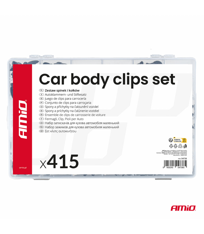 Zestaw spinek i kołków samochodowych duży 415szt. AMIO-04738 Profesjonalny zestaw 415 spinek i kołków montażowych przeznaczony do naprawy, serwisu i konserwacji nadwozi samochodowych. Zawiera różnorodne spinki, klipsy i kołki, umożliwiające bezpieczne mocowanie paneli karoserii, listew, osłon plastikowych oraz innych elementów nadwozia. Elementy wykonane z wysokiej jakości tworzywa sztucznego, odpornego na odkształcenia, pękanie i działanie warunków atmosferycznych. Zestaw jest niezbędnym...