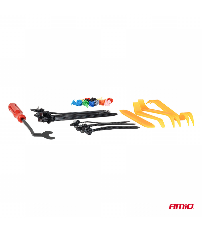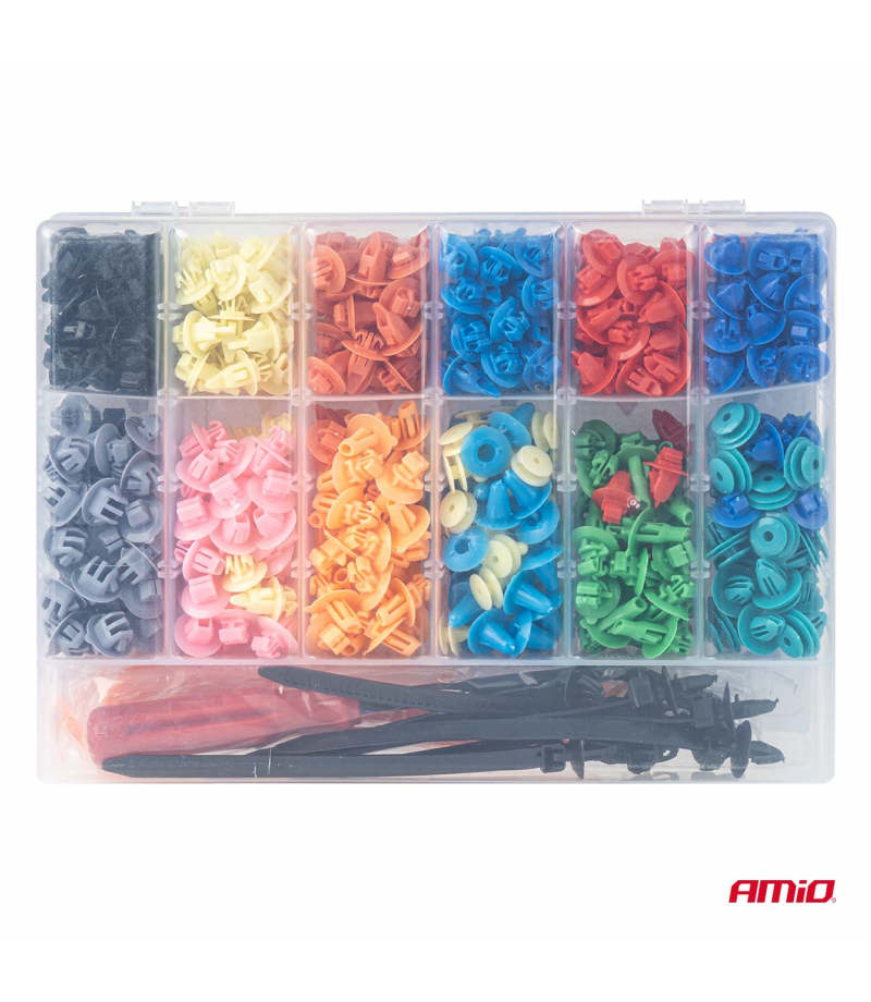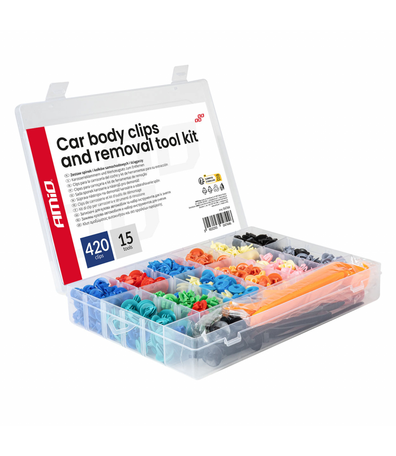 Zestaw spinek i kołków samochodowych i ściągaczy 420+15szt. AMIO-04744 Profesjonalny zestaw 420 spinek i kołków montażowych wraz z 15 narzędziami do demontażu i montażu elementów nadwozia samochodowego. Zestaw umożliwia szybki, precyzyjny i bezpieczny montaż paneli karoserii, listew, osłon plastikowych oraz innych elementów nadwozia. Elementy wykonane z trwałego tworzywa sztucznego, odpornego na odkształcenia, pękanie i działanie warunków atmosferycznych. Narzędzia stalowe zapewniają...