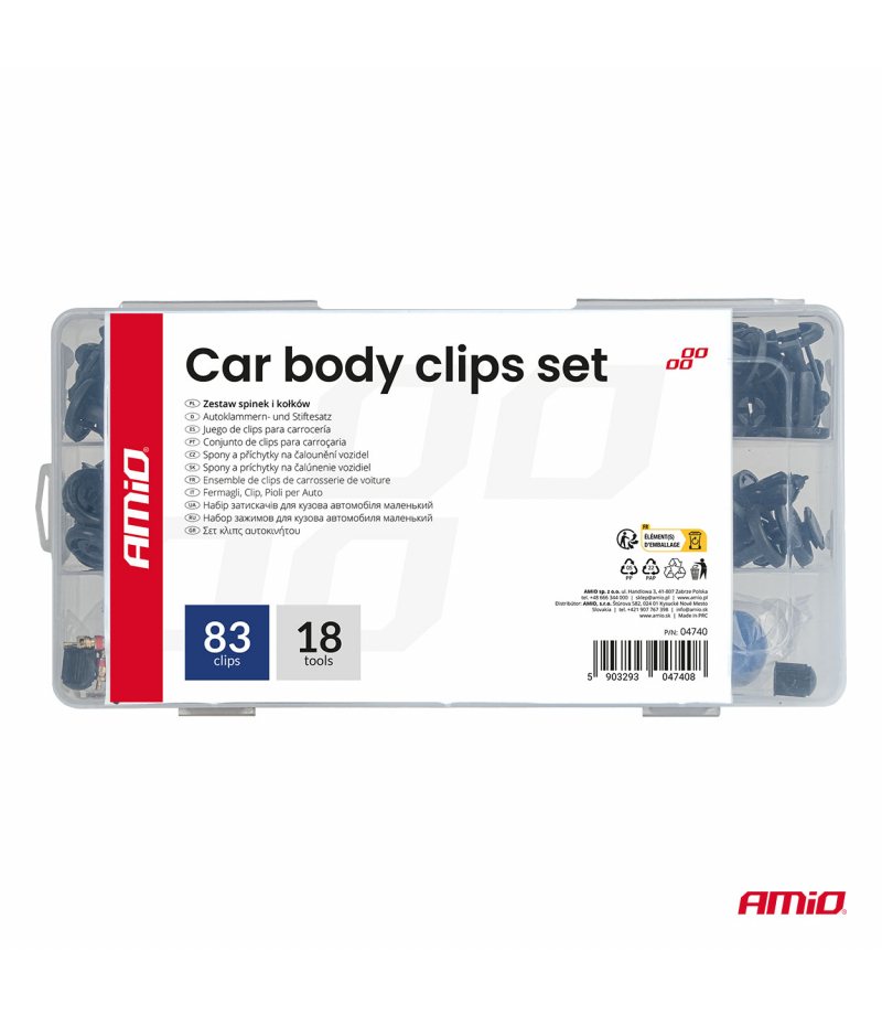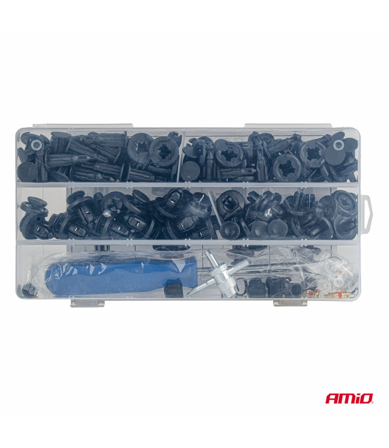 Zestaw spinek i kołków samochodowych mały z narzędziami 83+18szt.AMIO-04740 Profesjonalny zestaw spinek i kołków montażowych wraz z narzędziami do demontażu i montażu elementów nadwozia samochodowego. Zestaw zawiera 83 spinki i kołki oraz 18 specjalistycznych narzędzi, umożliwiających szybki, bezpieczny i precyzyjny montaż paneli karoserii, listew, osłon plastikowych oraz innych elementów nadwozia. Elementy wykonane z trwałego tworzywa sztucznego, odpornego na odkształcenia, pękanie i...