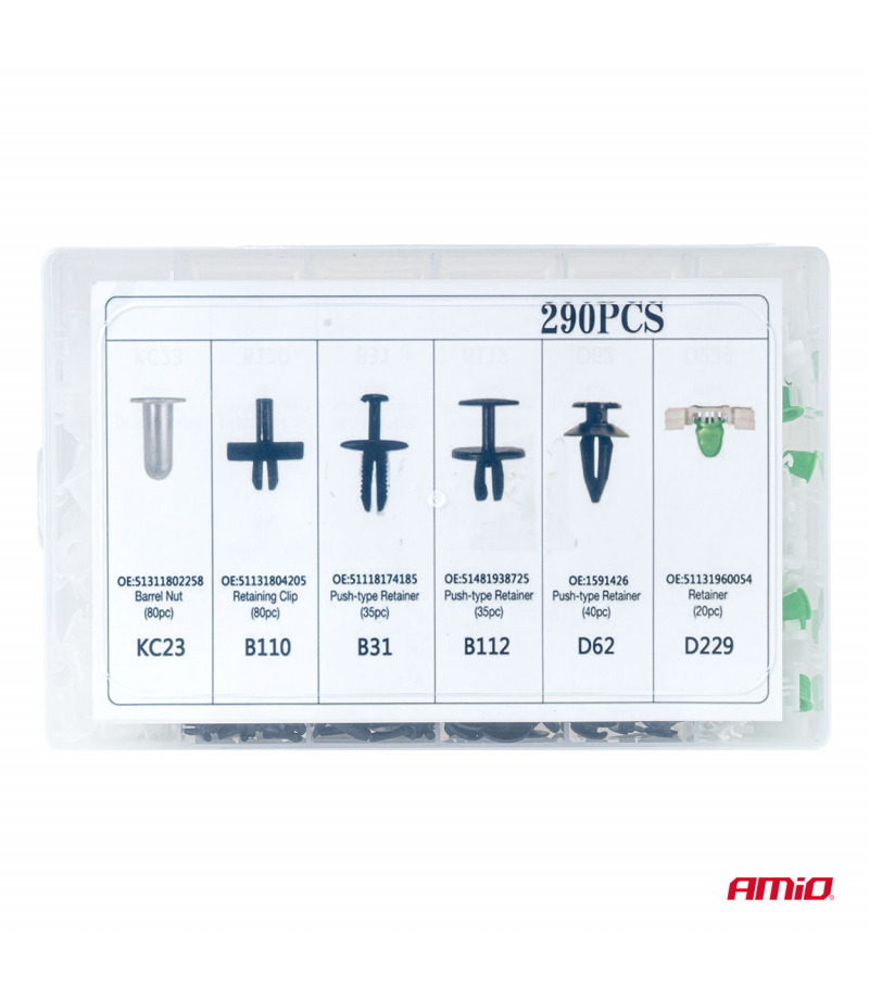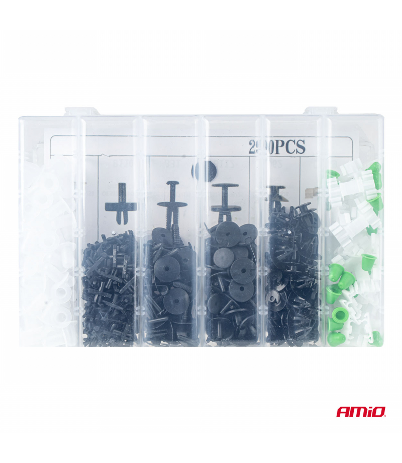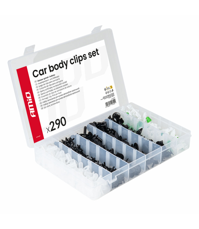 Zestaw spinek i kołków samochodowych średni 290szt. AMIO-04742 Profesjonalny zestaw 290 spinek i kołków montażowych przeznaczony do naprawy, serwisu i konserwacji nadwozi samochodowych. Zawiera różnorodne spinki, klipsy i kołki, umożliwiające bezpieczne mocowanie paneli karoserii, listew, osłon plastikowych oraz innych elementów nadwozia. Elementy wykonane z wysokiej jakości tworzywa sztucznego, odpornego na odkształcenia, pękanie i działanie warunków atmosferycznych. Zestaw jest...