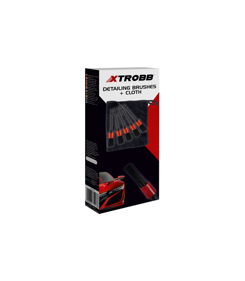 PĘDZLE DETAILINGOWE 5szt + ŚCIERECZKA 5 ROZMIARÓW PĘDZLI W ZESTAWIE – w zestawie jest 5 pędzli, każdy innej średnicy + ściereczka z microfibry. Takie rozwiązanie sprawia, że z zestawem XTROBB dotrzesz do każdego miejsca w samochodzie. Średnica pędzli to: 2cm, 2,5cm, 3cm, 3,5cm oraz 4cm. ZASTOSOWANIE - pędzle do czyszczenia detali wnętrza, idealnie usuwają kurz, brud i pył z trudno dostępnych miejsc w samochodach osobowych, ciężarowych, motocyklach, skuterach, kładach itp....