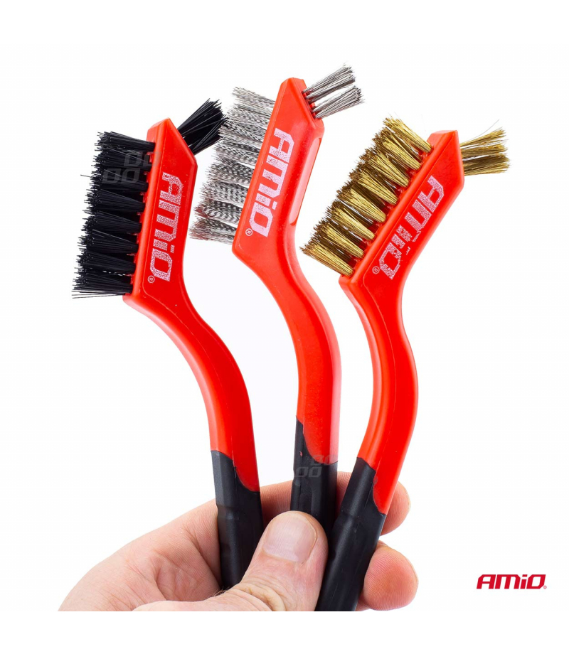 Opis produktu Szczotki wykonane z drutu stalowego , nylonowego i mosiężnego. Profilowane w sposób zwiększający efektywność czyszczenia. Przeznaczenie / zastosowanie Szczotki do czyszczenia twardych powierzchni z rdzy , farby, pyłów i innych lekkich zanieczyszczeń. ZALETY PRODUKTU: 3 szczotki ze zróżnicowanym włosiem długość całkowita: 180mm 3-rzędowe włosie włosie ze stali nierdzewnej, mosiądzu i nylonu Ilość w opakowaniu [szt.]: 1...