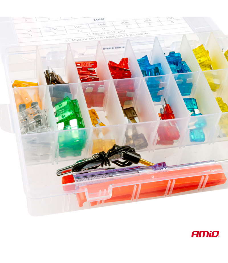 Zawiera bezpieczniki typu mini i standard wykonanych z wysokiej jakości stopu cynku z próbnikiem napięcia w zakresie 6-24V oraz chwytakiem.