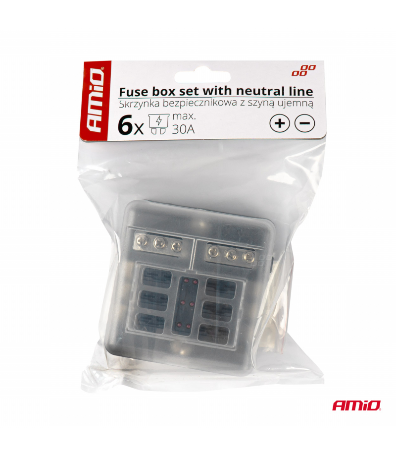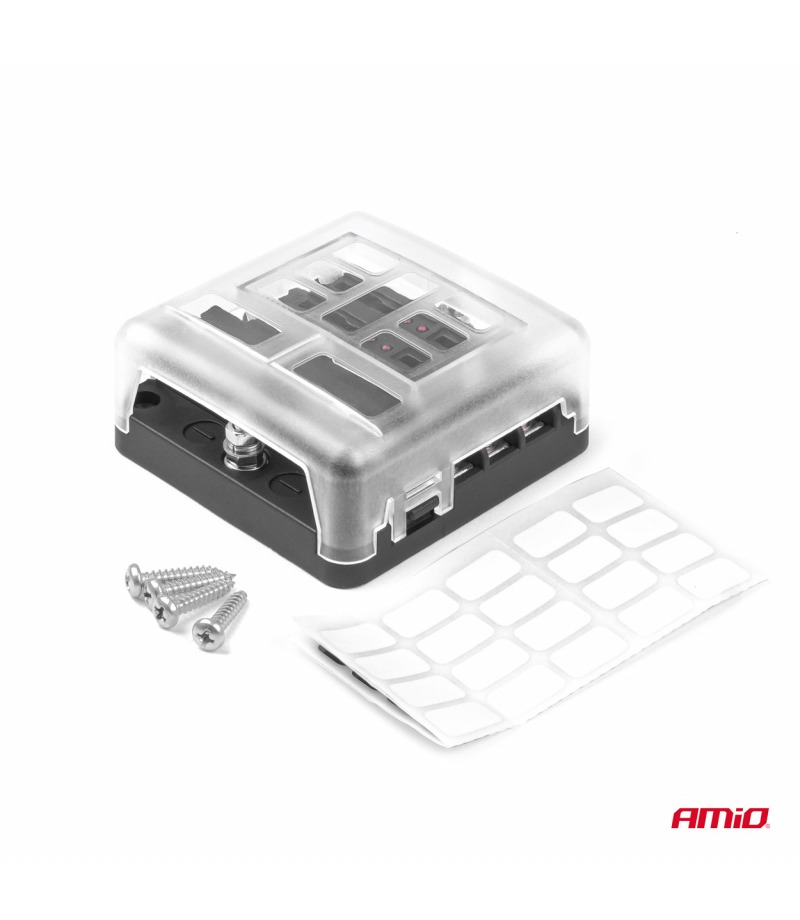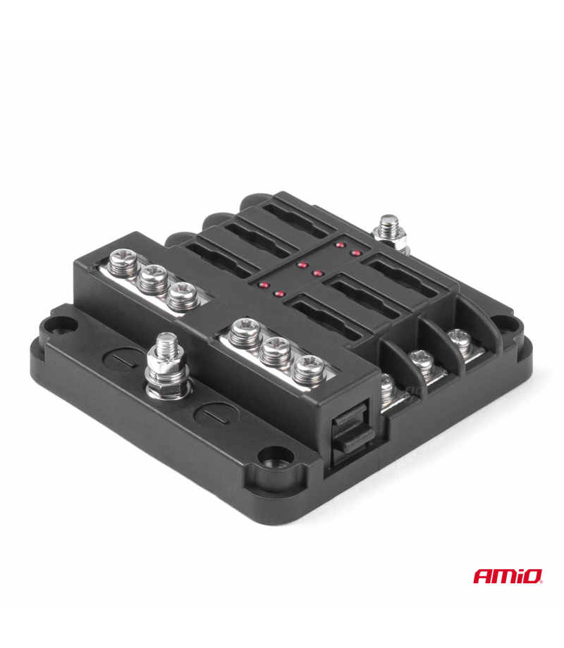 Uniwersalna skrzynka bezpiecznikowa 6-obwodowa plus dodatkowo szyna masy. W przypadku przepalenia bezpiecznika czerwona dioda led znajdująca się przy każdym gnieździe zapala się, dzięki czemu można szybko i bez problemu ustalić na którym obwodzie jest usterka.