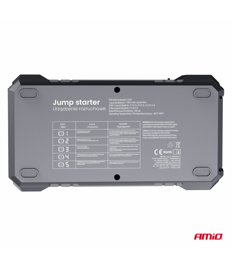 Urządzenie rozruchowe AMiO 4w1 to wielofunkcyjny sprzęt przeznaczony dla warsztatów, serwisów oraz użytkowników indywidualnych. Łączy w sobie funkcje boostera rozruchowego, kompresora powietrza, powerbanku oraz latarki LED, co czyni go niezawodnym rozwiązaniem w sytuacjach awaryjnych i codziennym użytkowaniu.