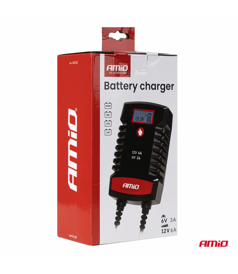 Cyfrowy prostownik AMiO PRO HOOK to nowoczesne urządzenie przeznaczone do ładowania akumulatorów AGM, GEL oraz LiFePo4 (LFP) . Dzięki maksymalnemu prądowi ładowania 6 A i obsłudze napięć 6V i 12V , zapewnia szybkie, bezpieczne i precyzyjne uzupełnianie energii akumulatorów w pojazdach osobowych, motocyklach, łodziach i małym sprzęcie profesjonalnym. Ładowarka z funkcją podtrzymywania napięcia z wbudowanym hakiem do podwieszenia pod maską. Posiada szybkozłączkę oraz dodatkowe konektory oczkowe w zestawie. Optymalna do ładowania akumulatorów motocyklowych i samochodów osobowych z silnikami benzynowymi oraz diesla o małej pojemności, dodatkowo posiada dedykowaną funkcję ładowania akumulatorów LFP.