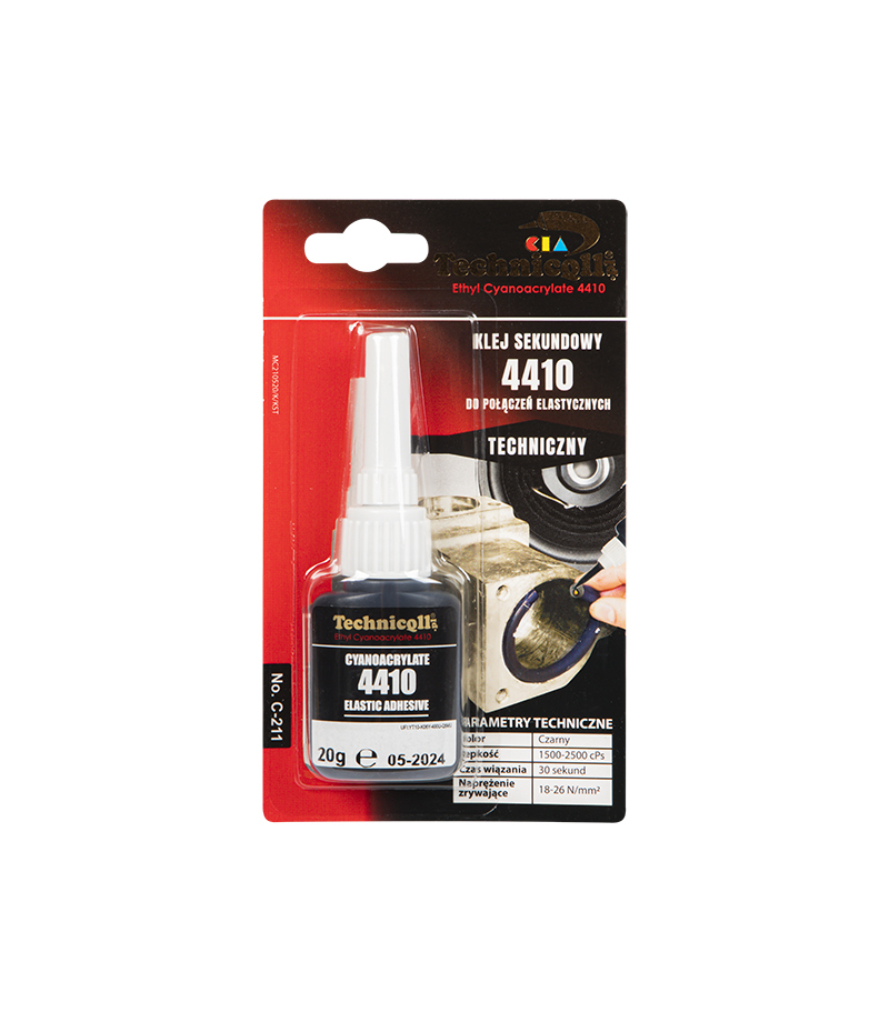 Cyjanoakrylowy techniczny klej przemysłowy 4410 to specjalistyczny klej z dodatkiem sproszkowanej gumy. Charakteryzuje się krtkim czasem sieciowania i zwiększoną elastycznością utworzonej spoiny. Utwardzanie kleju następuje pod wpływem wilgoci zaabsorbowanej z powietrza na powierzchni klejonej. Dzięki dużej lepkości pozwala na wypełnienie szczelin o wielkości do 0,2 mm.