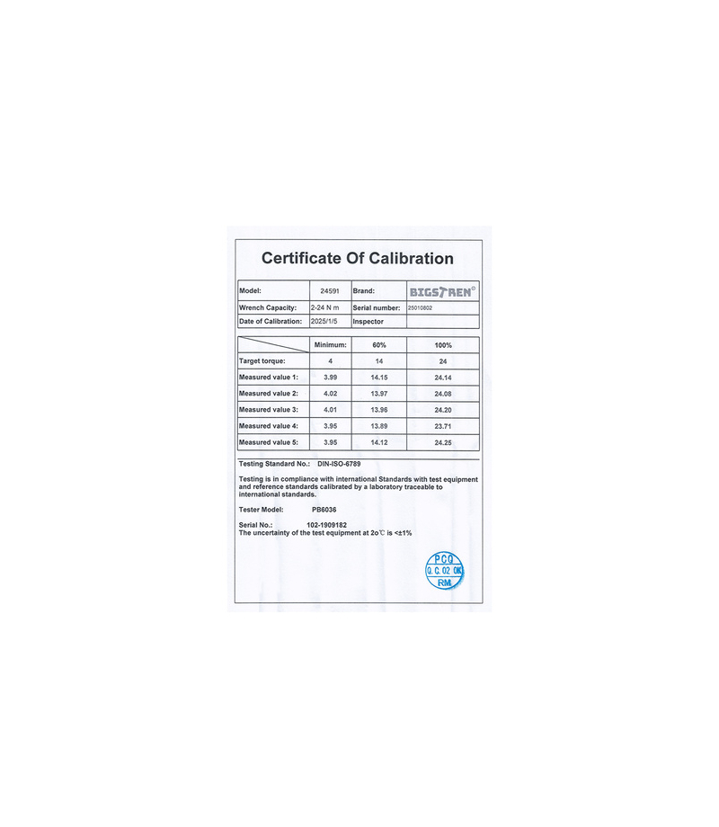 każdy klucz ma indywidualny certyfikat kalibracji i numer seryjny - kalibrowany i testowany klucz dynamometryczny działa dokładnie, możesz być pewny, że dokręci śruby z ustawioną siłą
